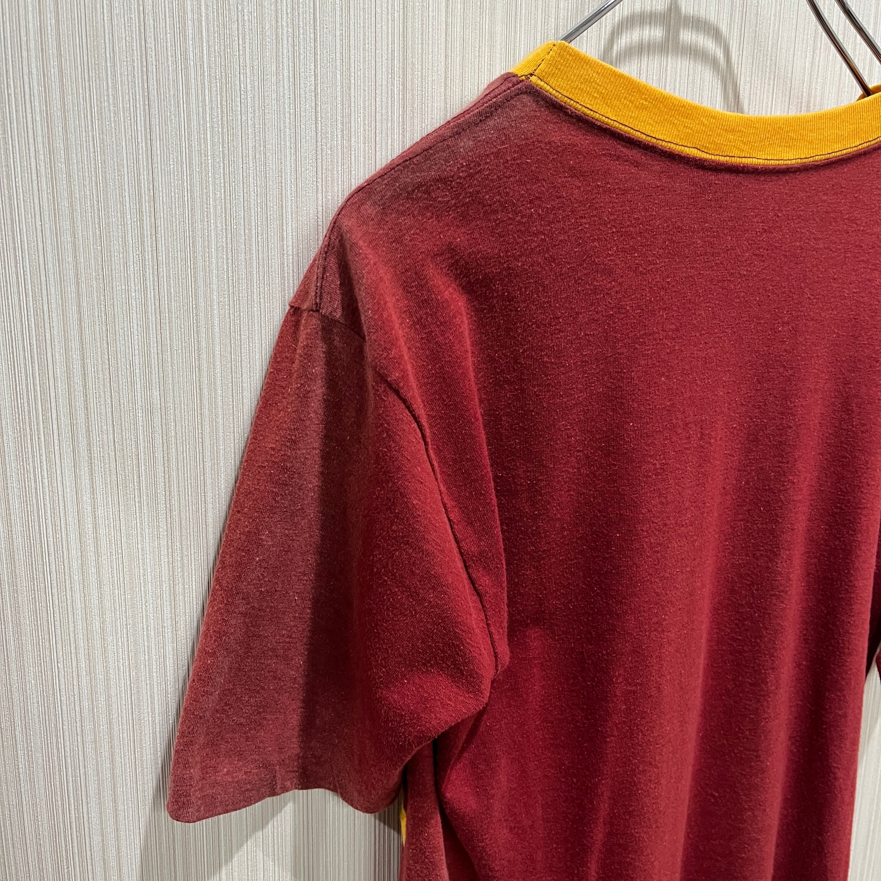 バーガンディカラーのKEYSTONE Tシャツ、ストライプデザイン、Mサイズ、ポリエステルとコットンの混合素材。
