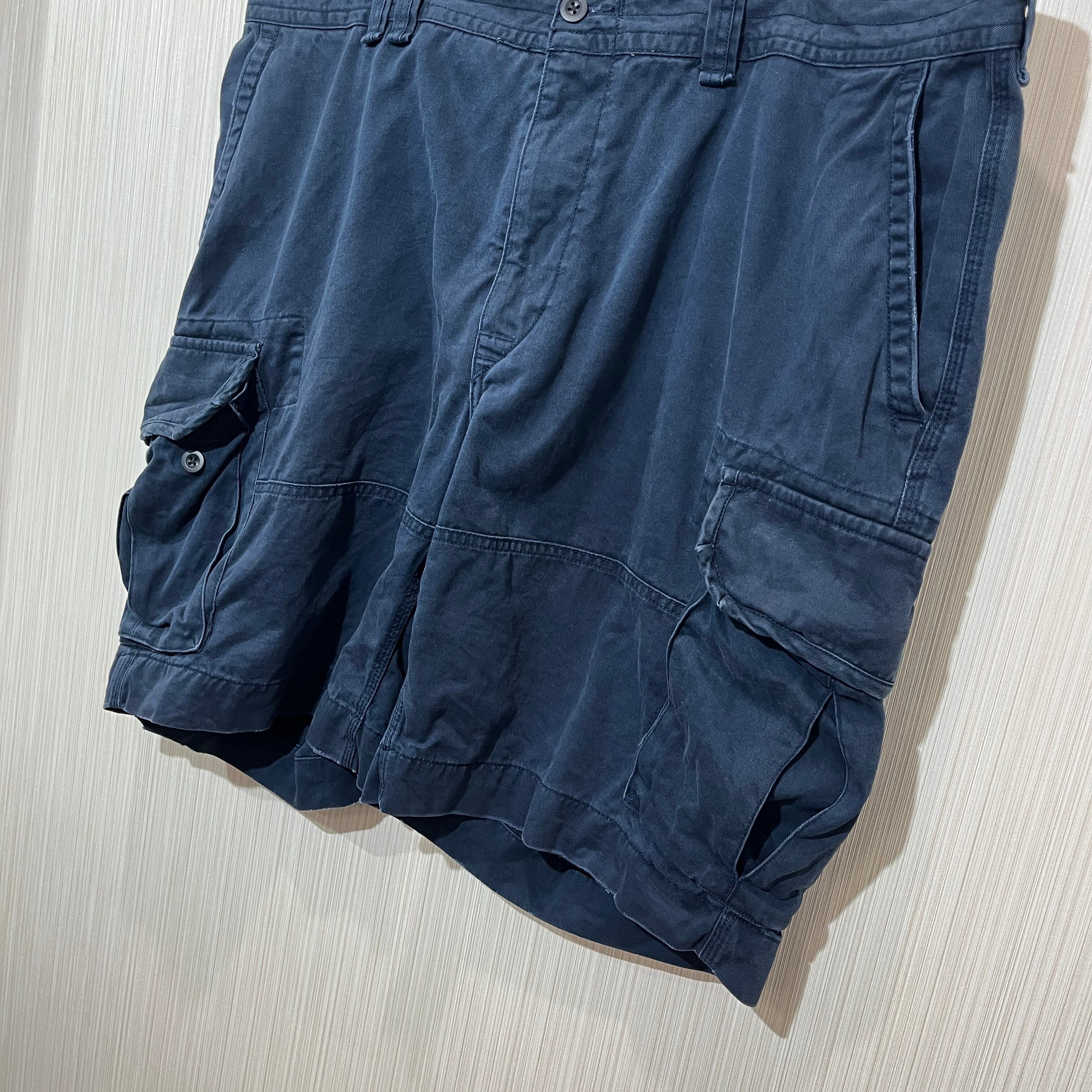 ネイビーのカーゴショートパンツ、サイドポケットとボタン付きポケットが特徴。