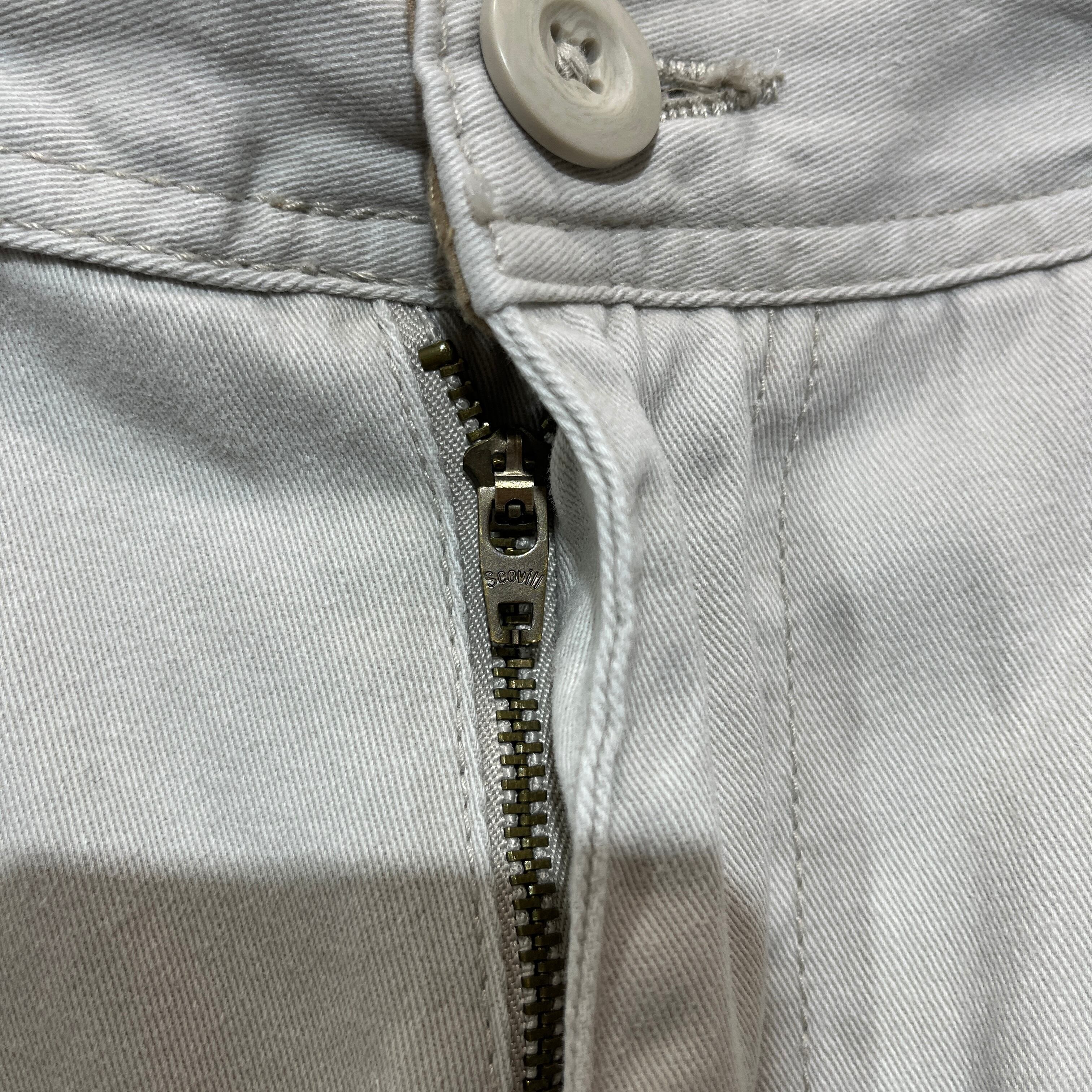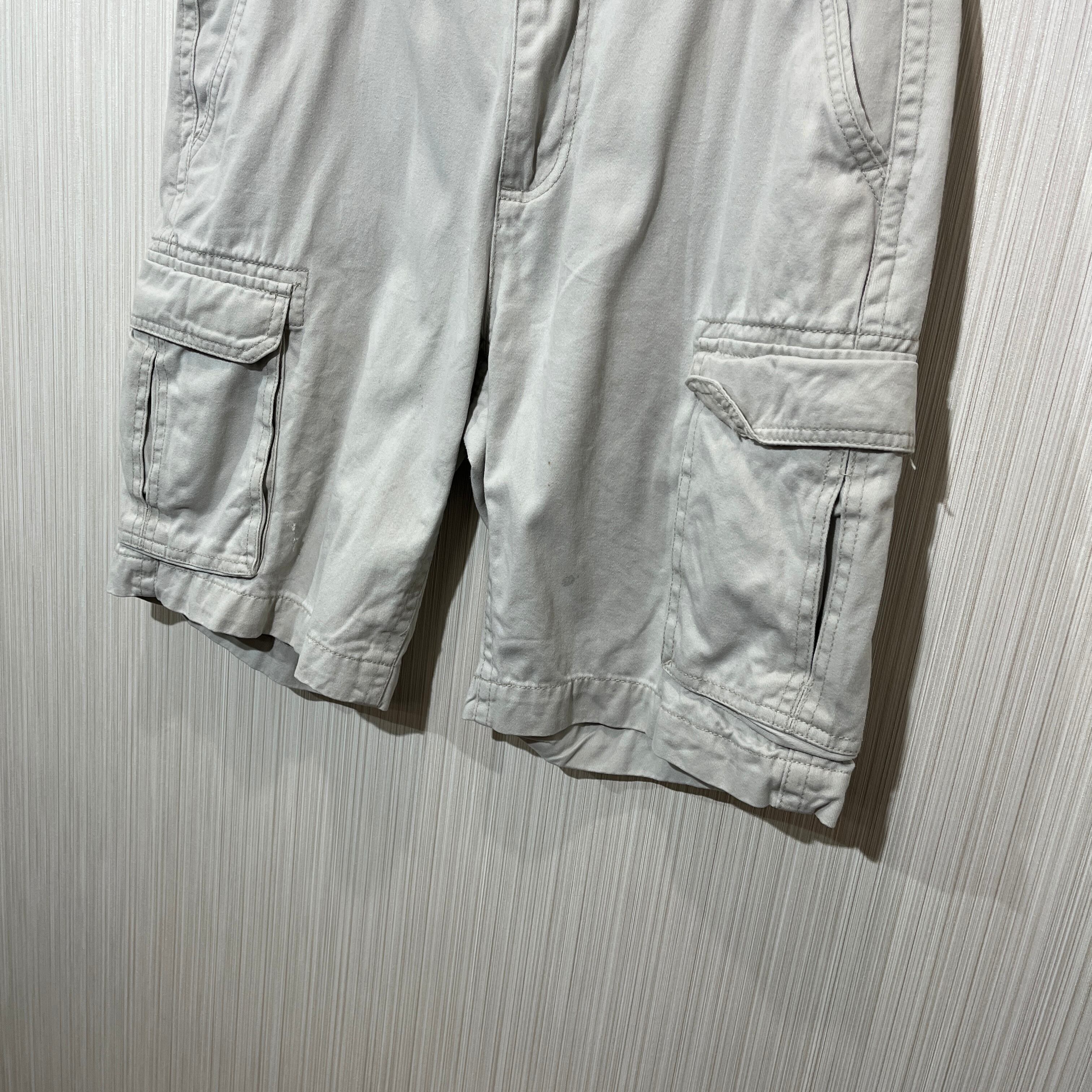 ライトグレーのカーゴショートパンツ、サイドポケット付きで実用的。