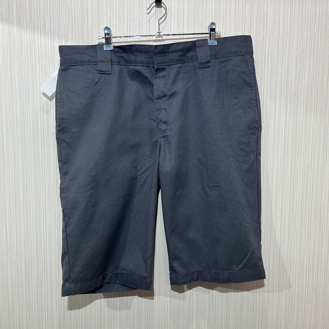 ダークグレーのスリムフィットショートパンツ、金属製ファスナー付き。