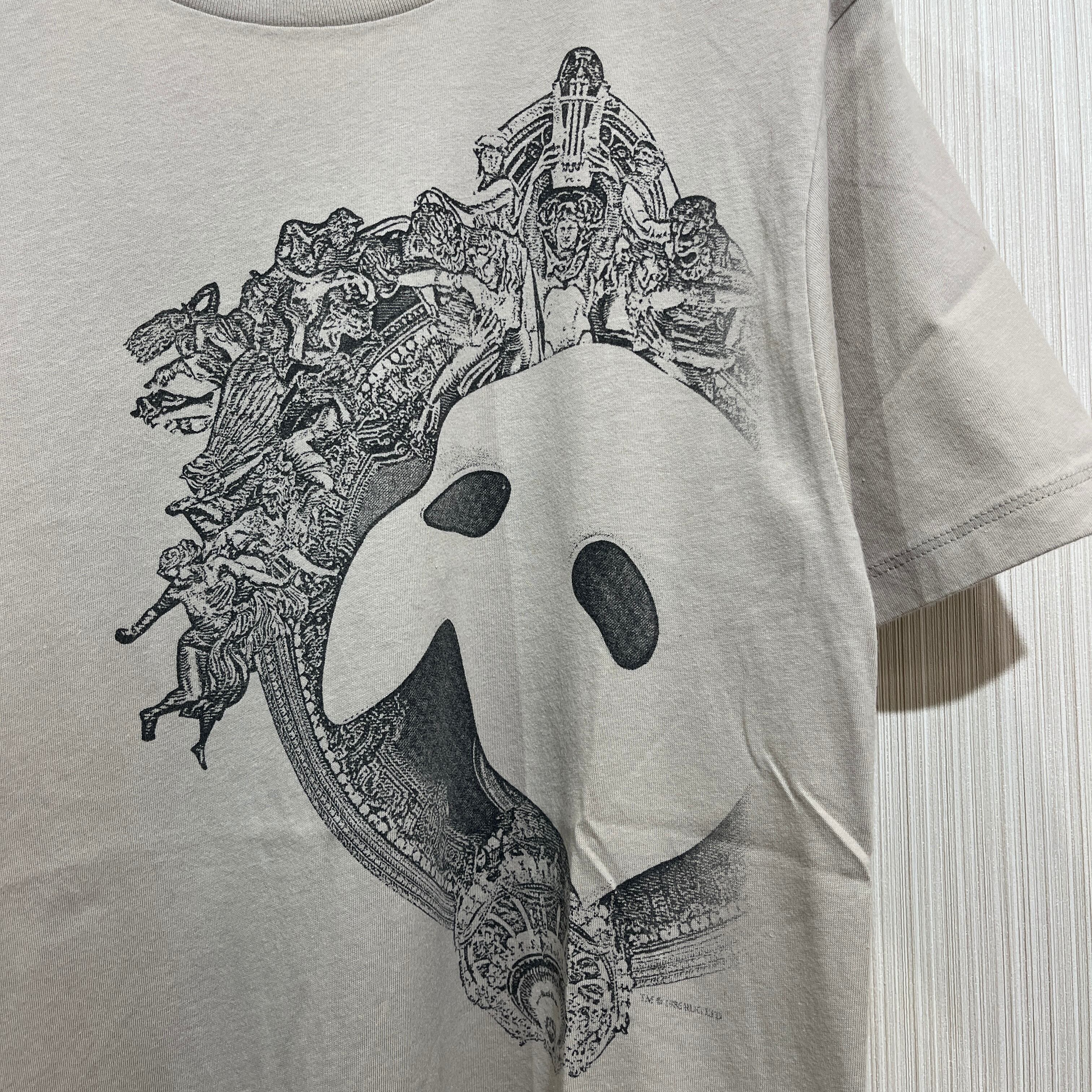 ベージュのグラフィックTシャツ、サイズS、ユニークな仮面デザイン。
