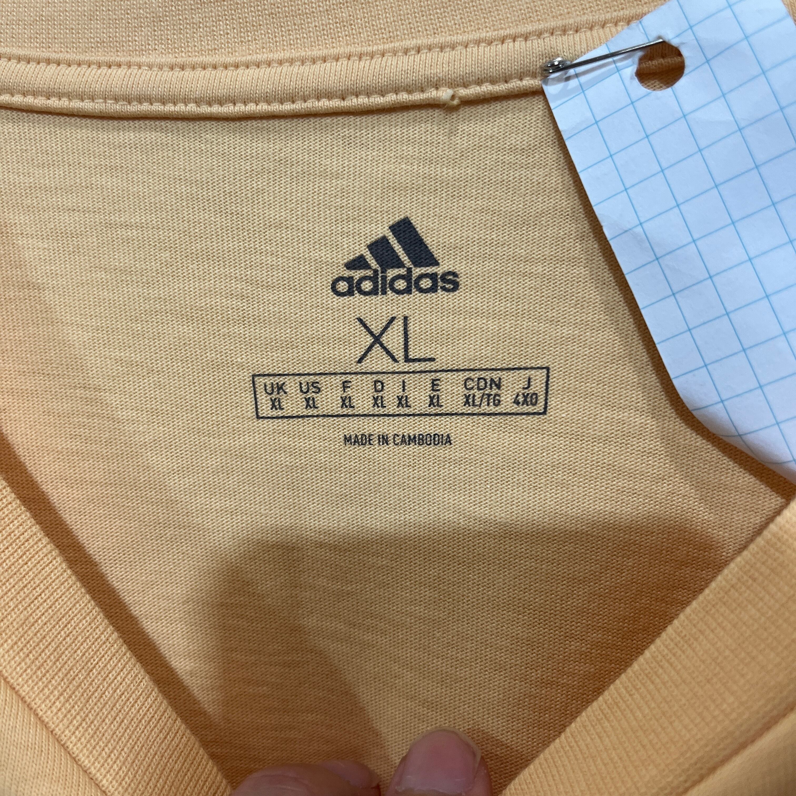 ベージュのadidasロゴが特徴的なXLサイズのTシャツ。