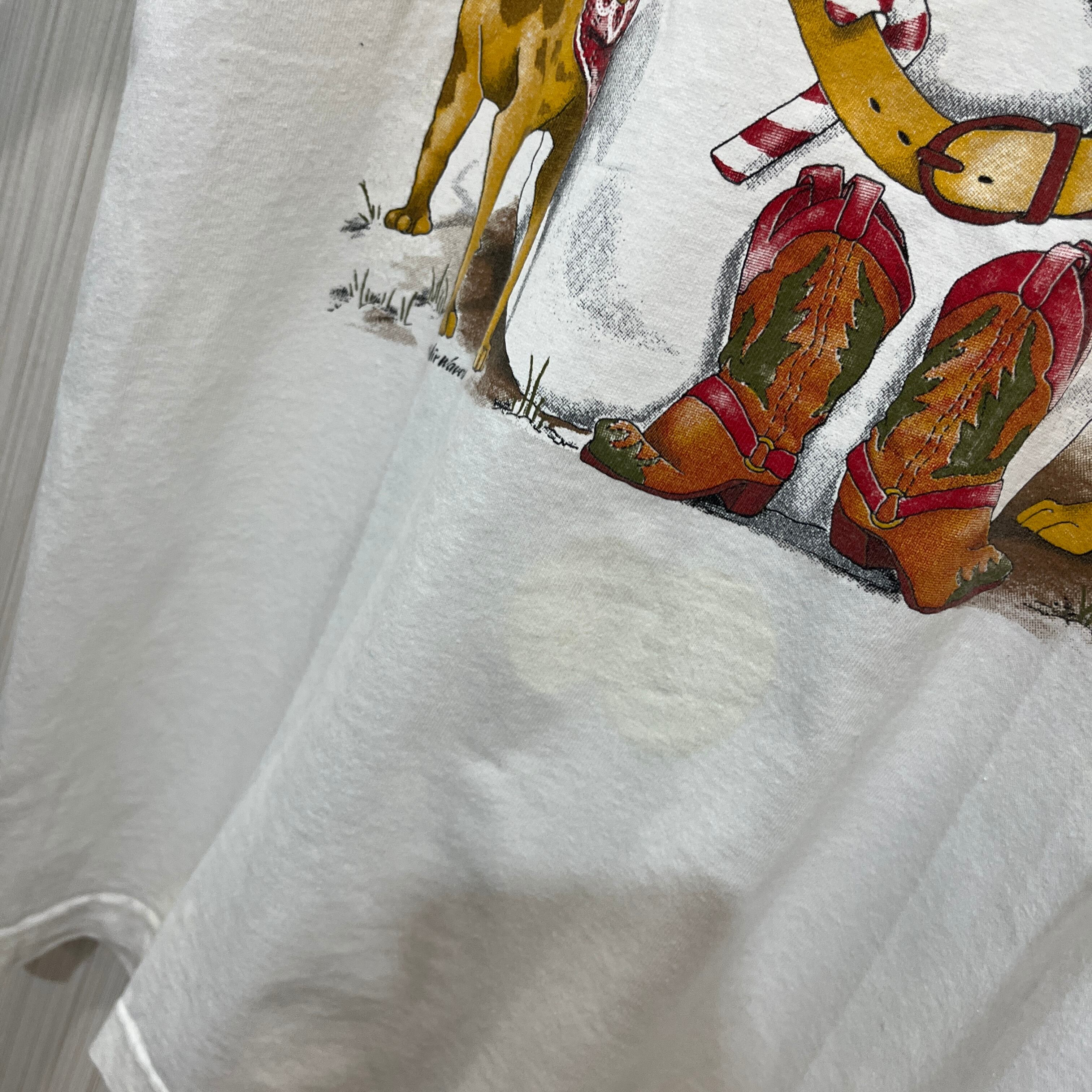 雪だるまと動物のユニークなイラストが特徴のカジュアルTシャツ。