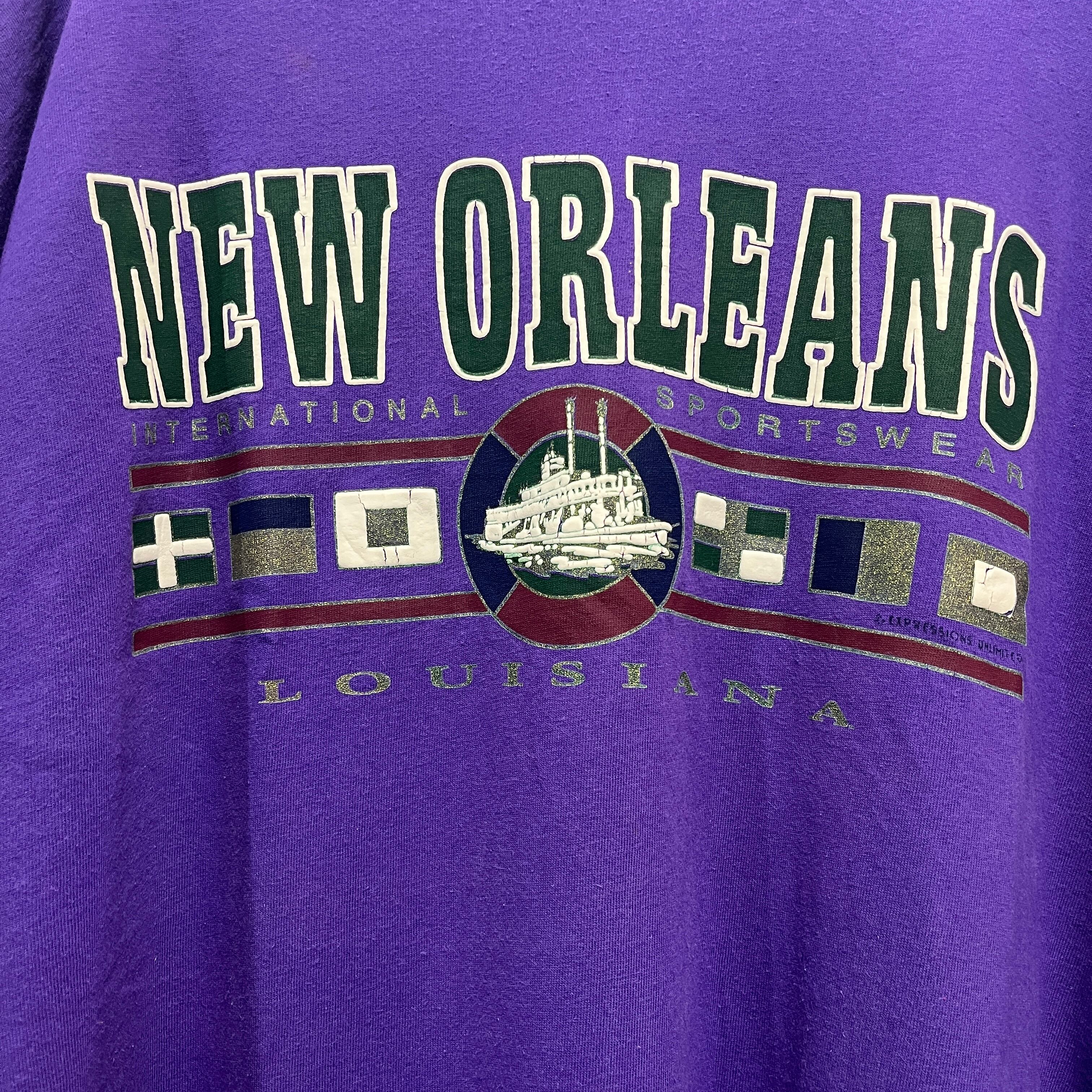 NEW ORLEANSのプリントが施された紫のオーバーサイズTシャツ。