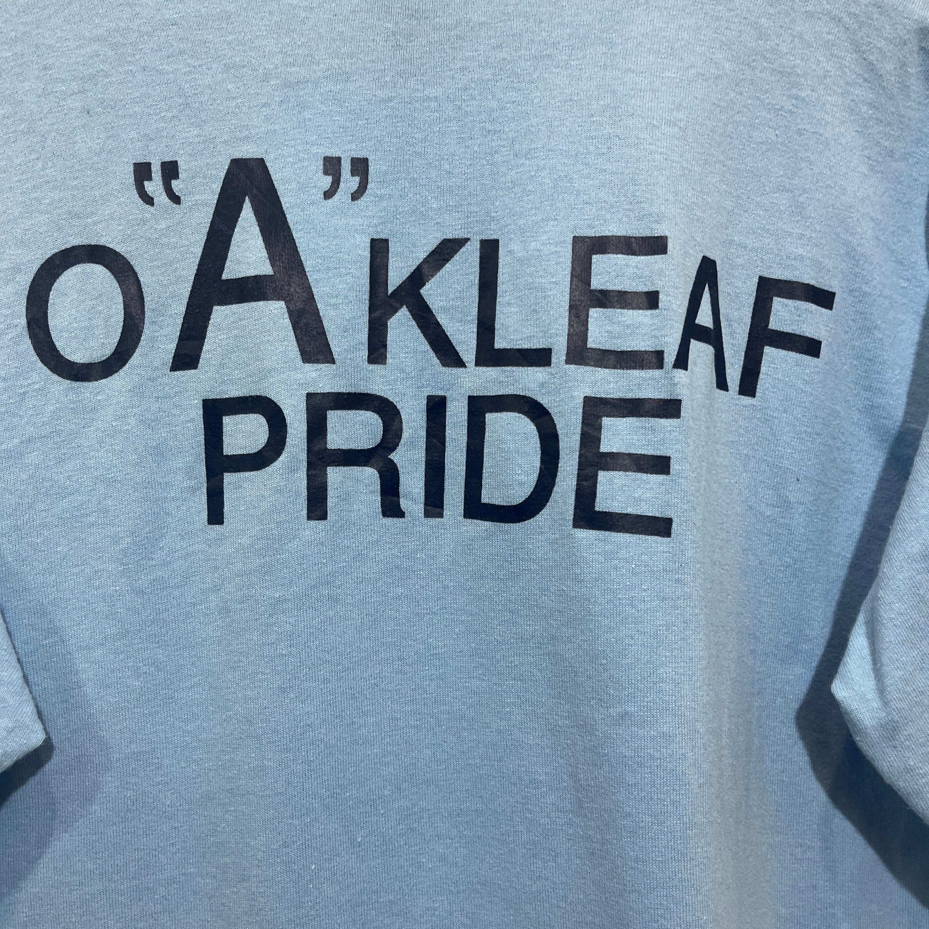 OakLeaf Schoolのイエロージャケットデザインの水色Tシャツ。
