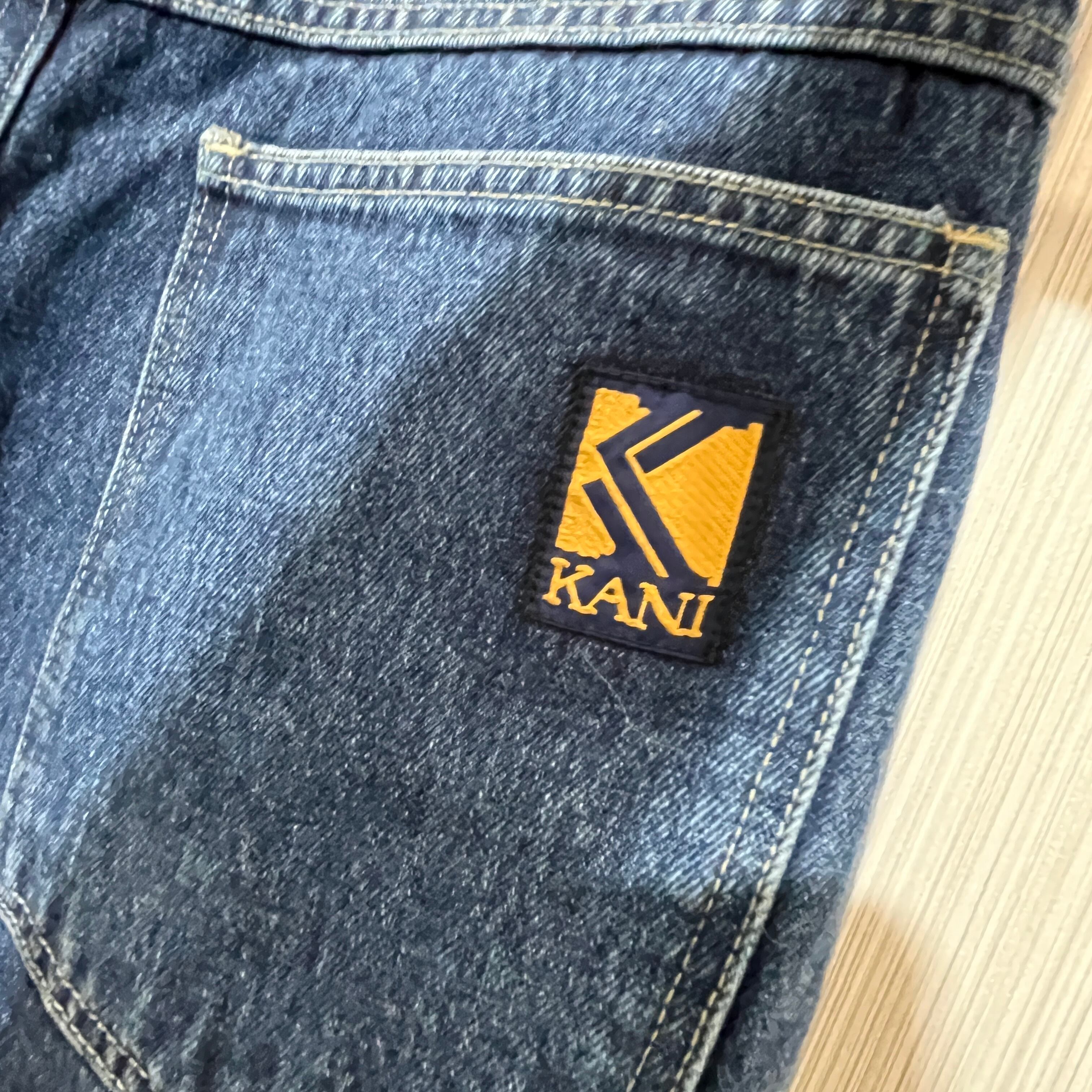 ダークブルーのストレートデニム、4ポケット仕様でメタルボタン付き。デッドストックの未使用ですがになります。