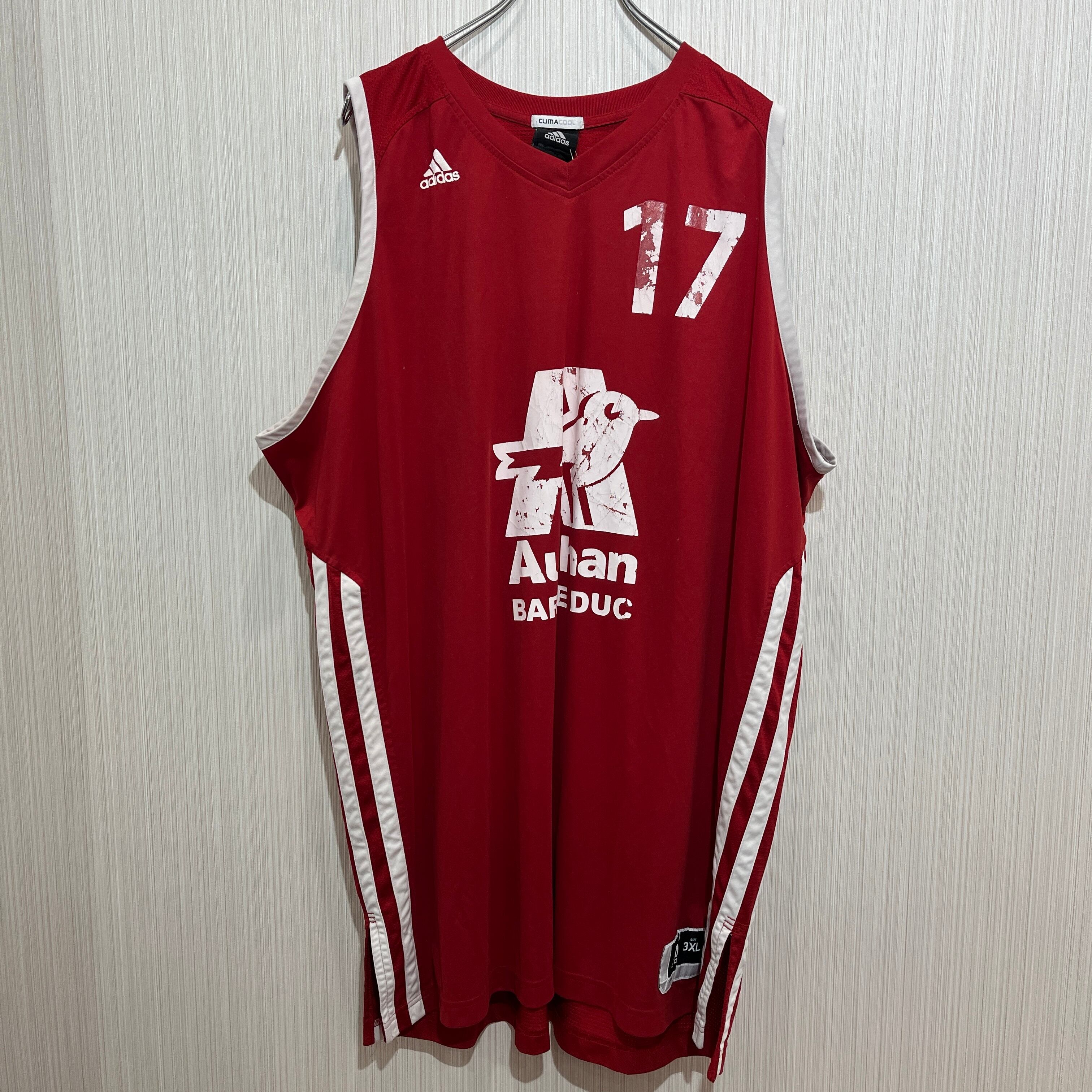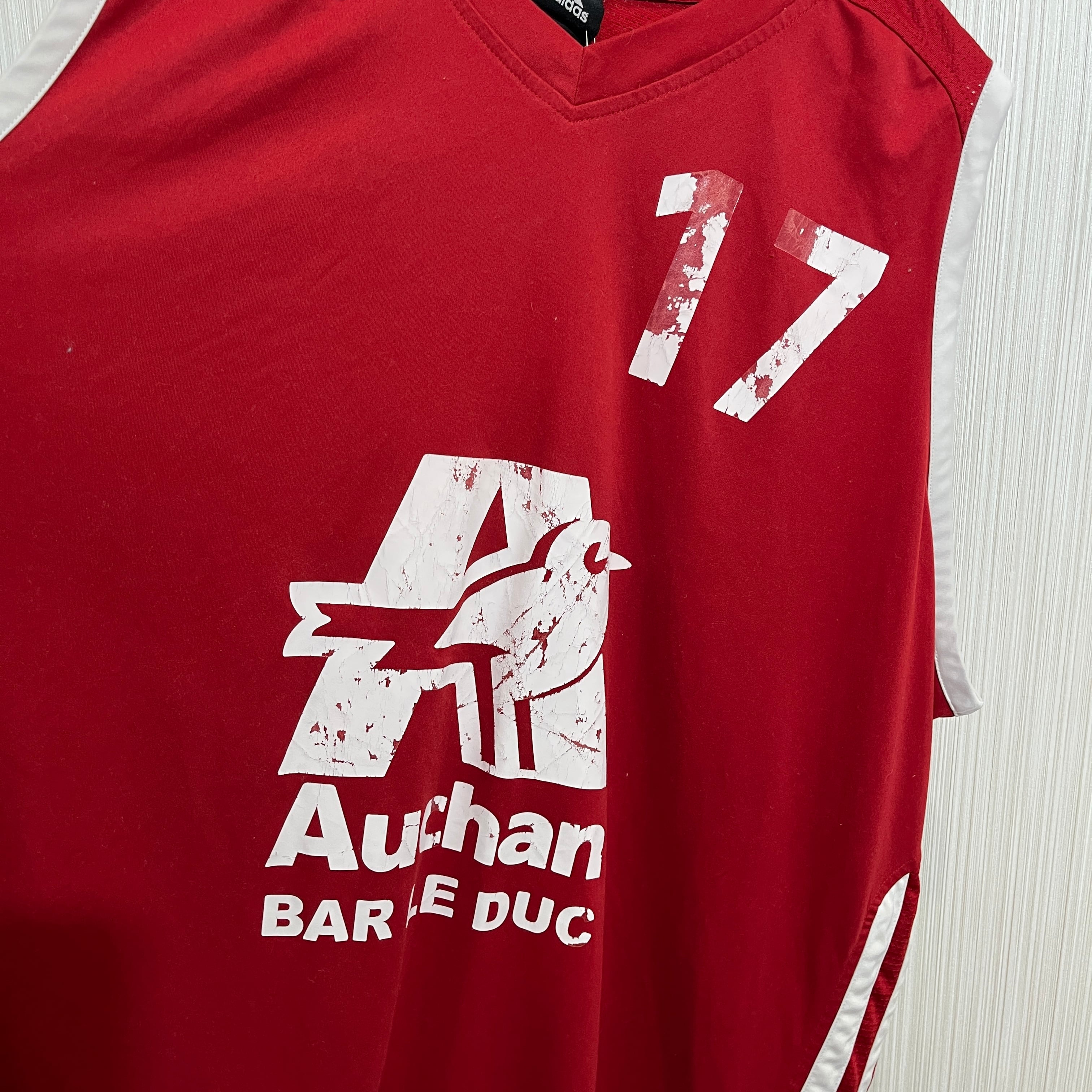 adidas製の赤いバスケットボールタンクトップ、Auchan BARLE DUCロゴ付き。