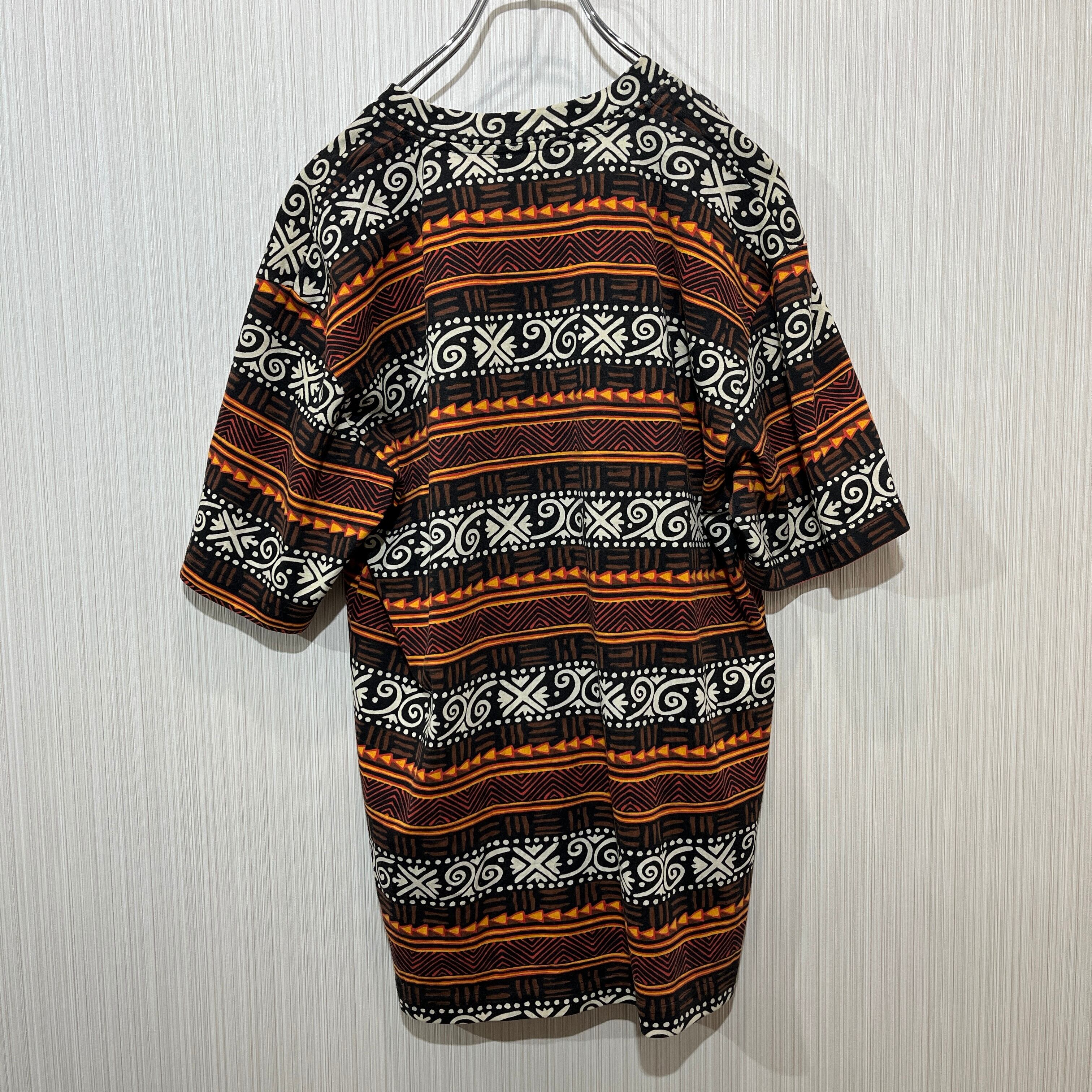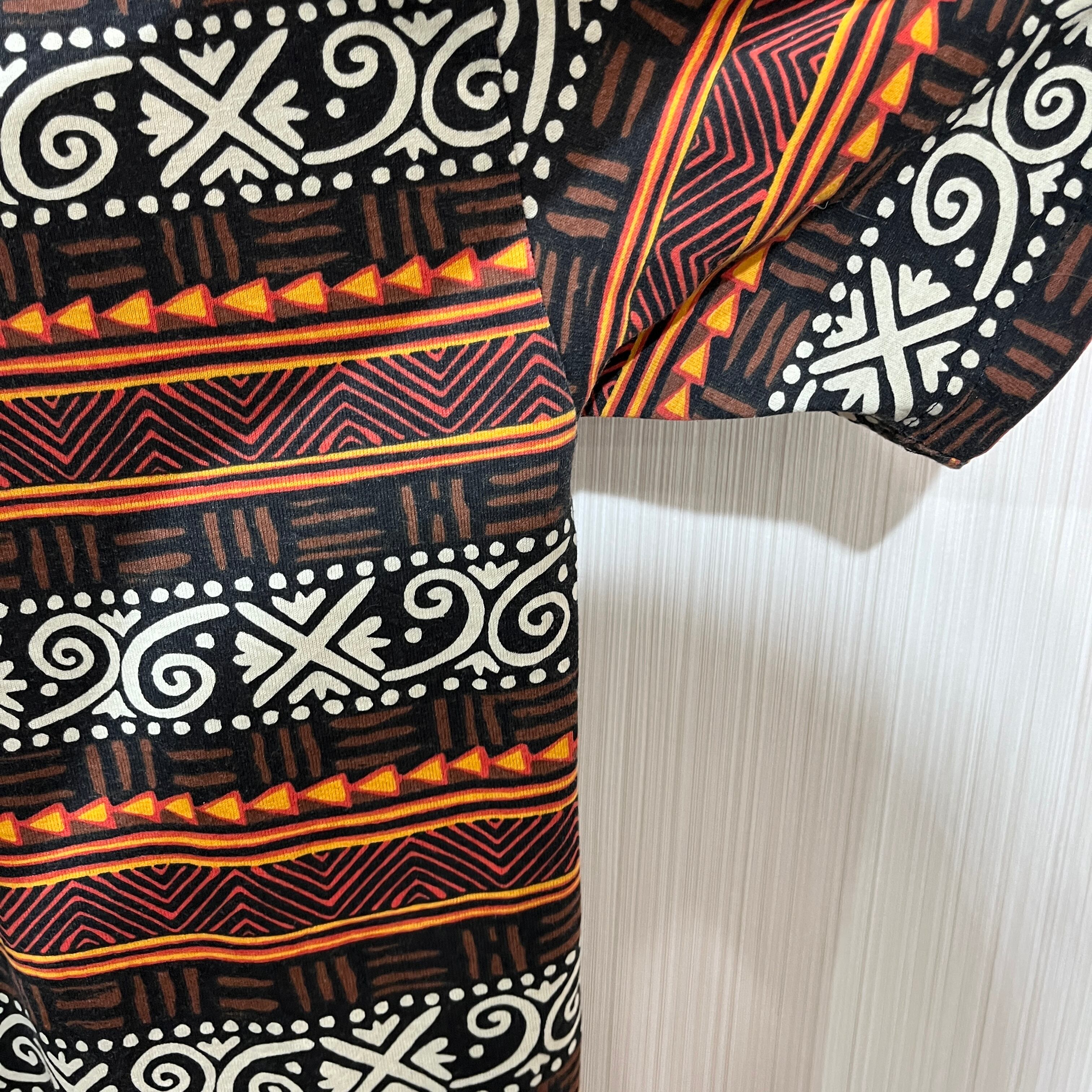 トライバル柄の半袖Tシャツ、コットンとポリエステルの混合素材で快適な着心地。