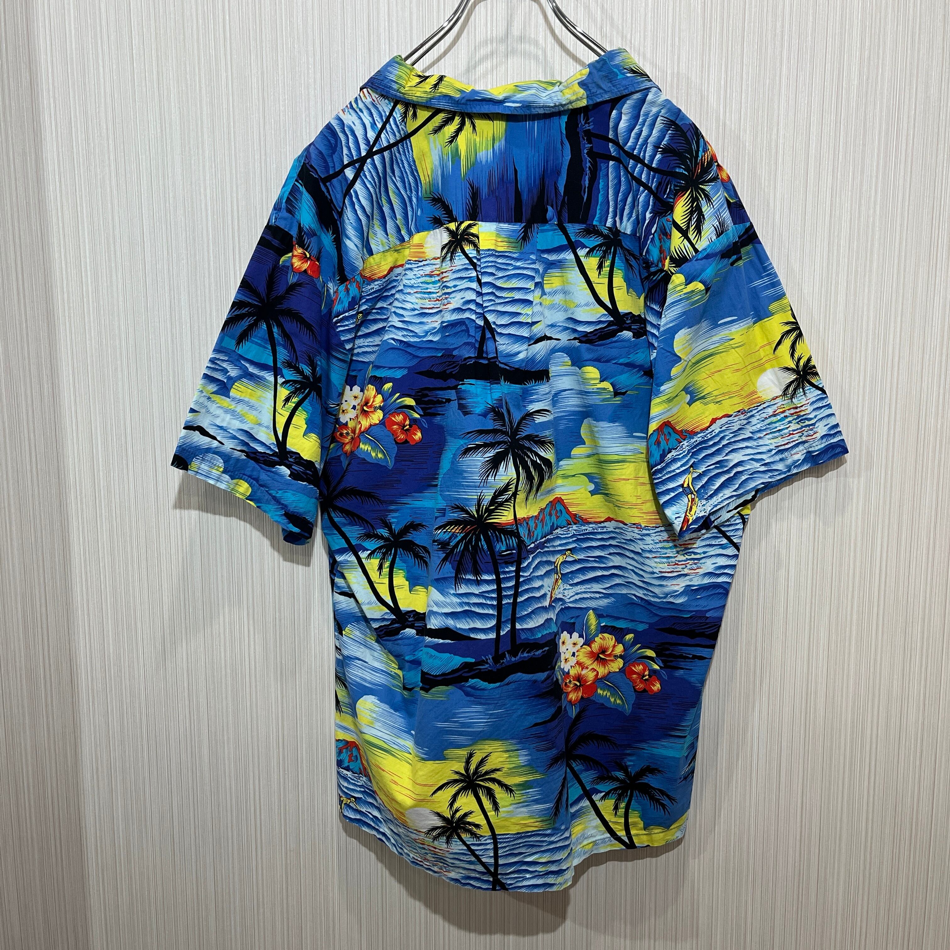 海と花のプリントが特徴的なXLサイズのアロハシャツ。