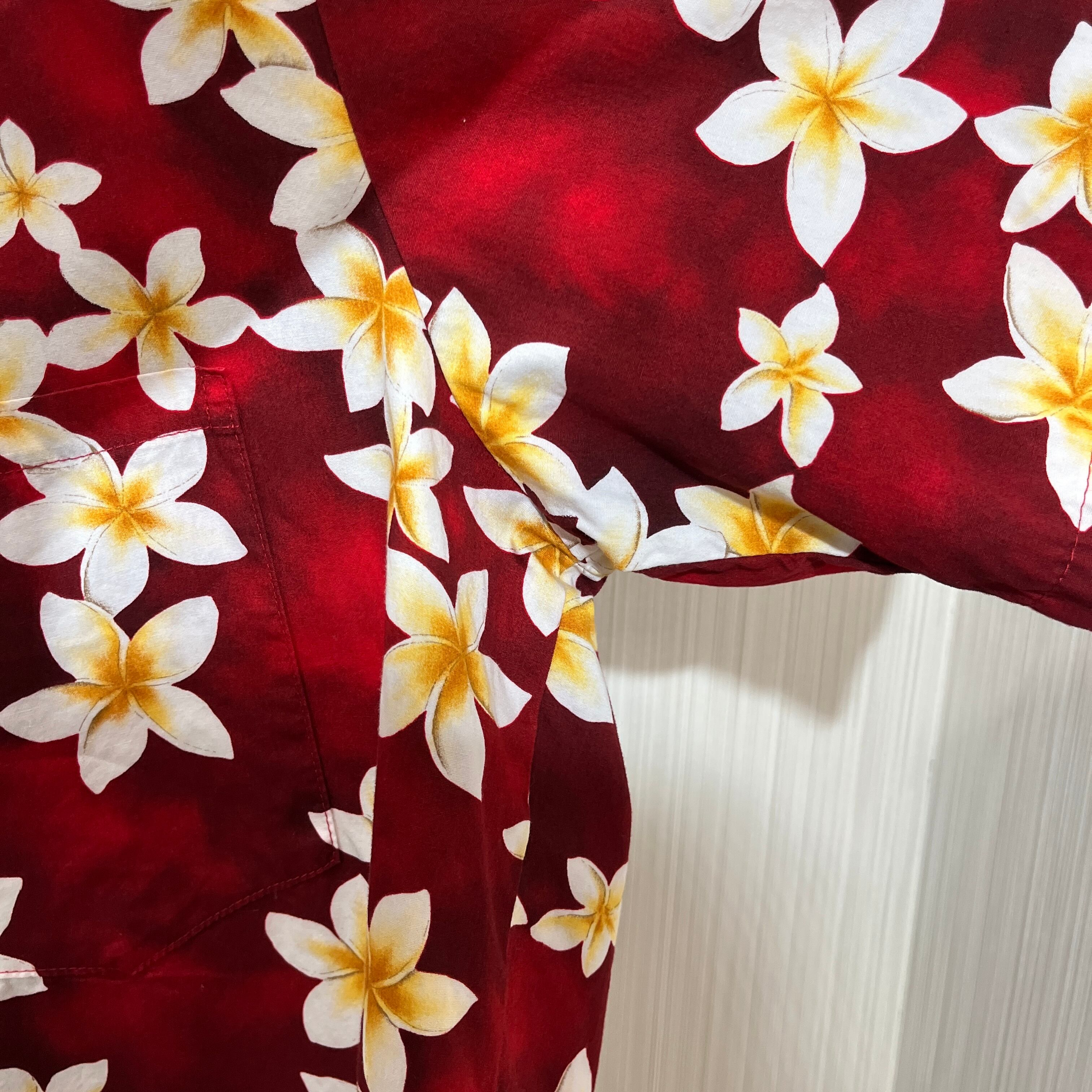 鮮やかな赤地に白と黄色の花柄が特徴のアロハシャツ。