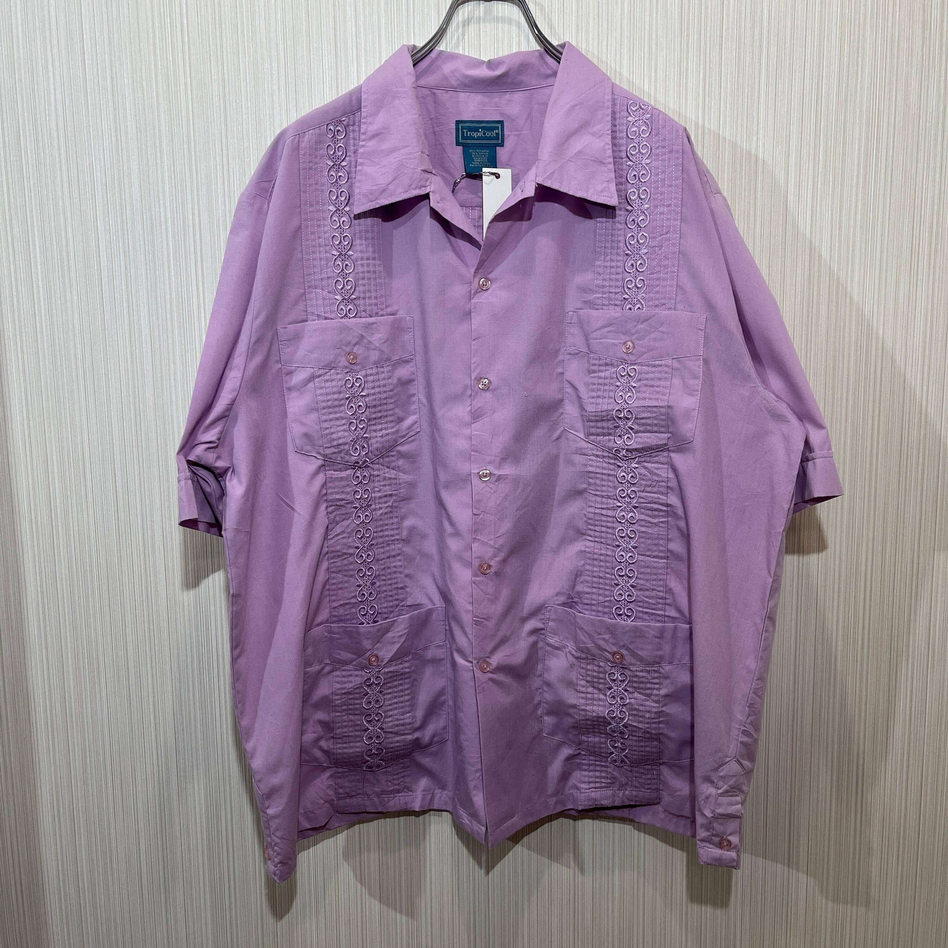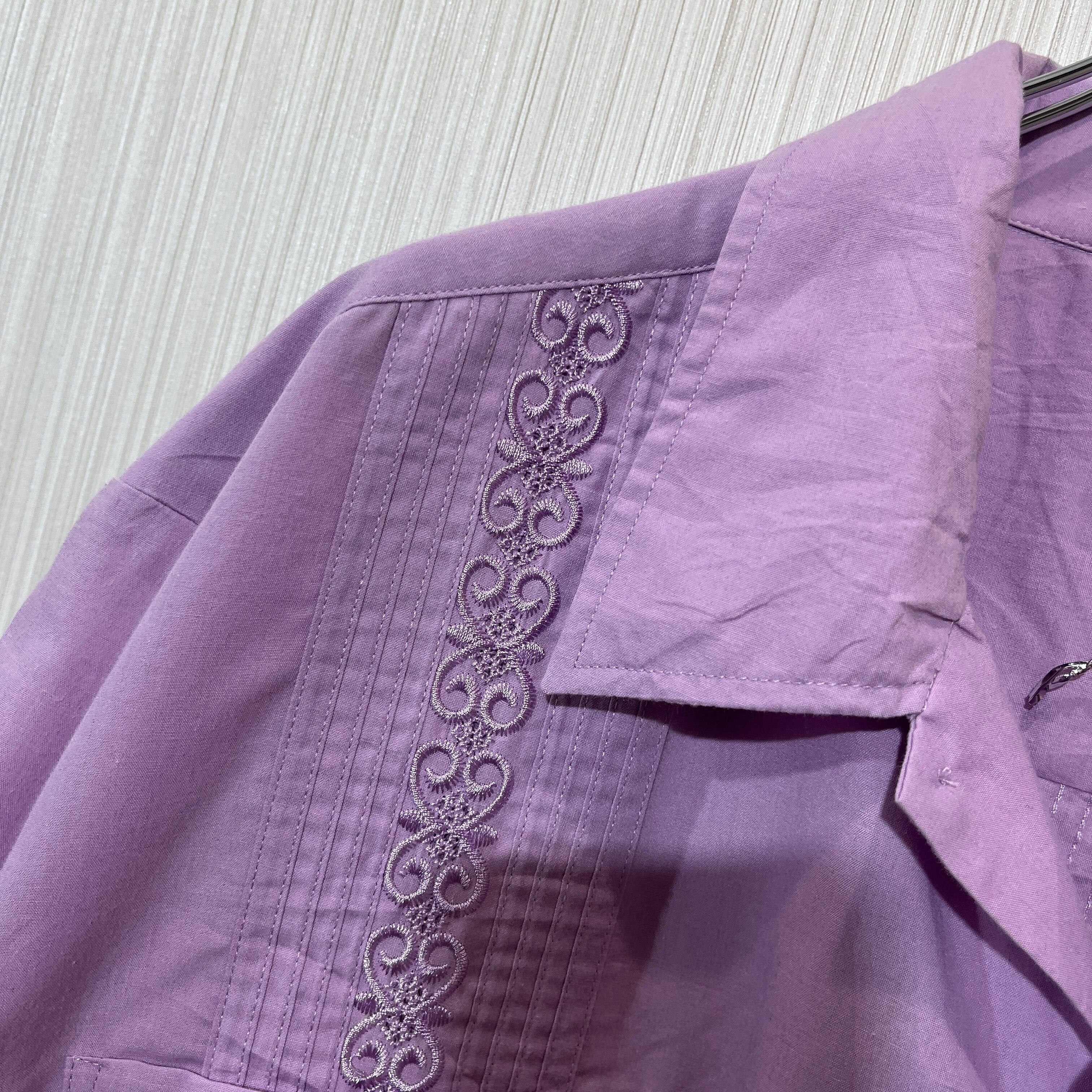 紫色の半袖シャツ、2つのポケットと刺繍ディテール付き。