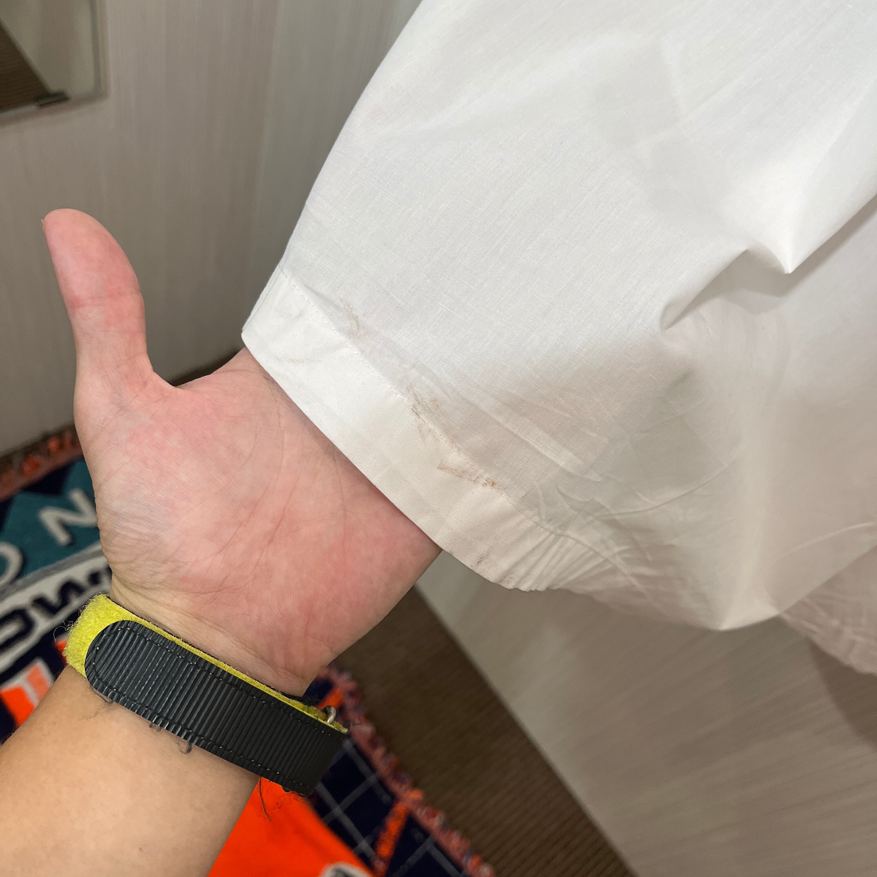 前面に刺繍付きポケットが特徴のホワイトシャツ。