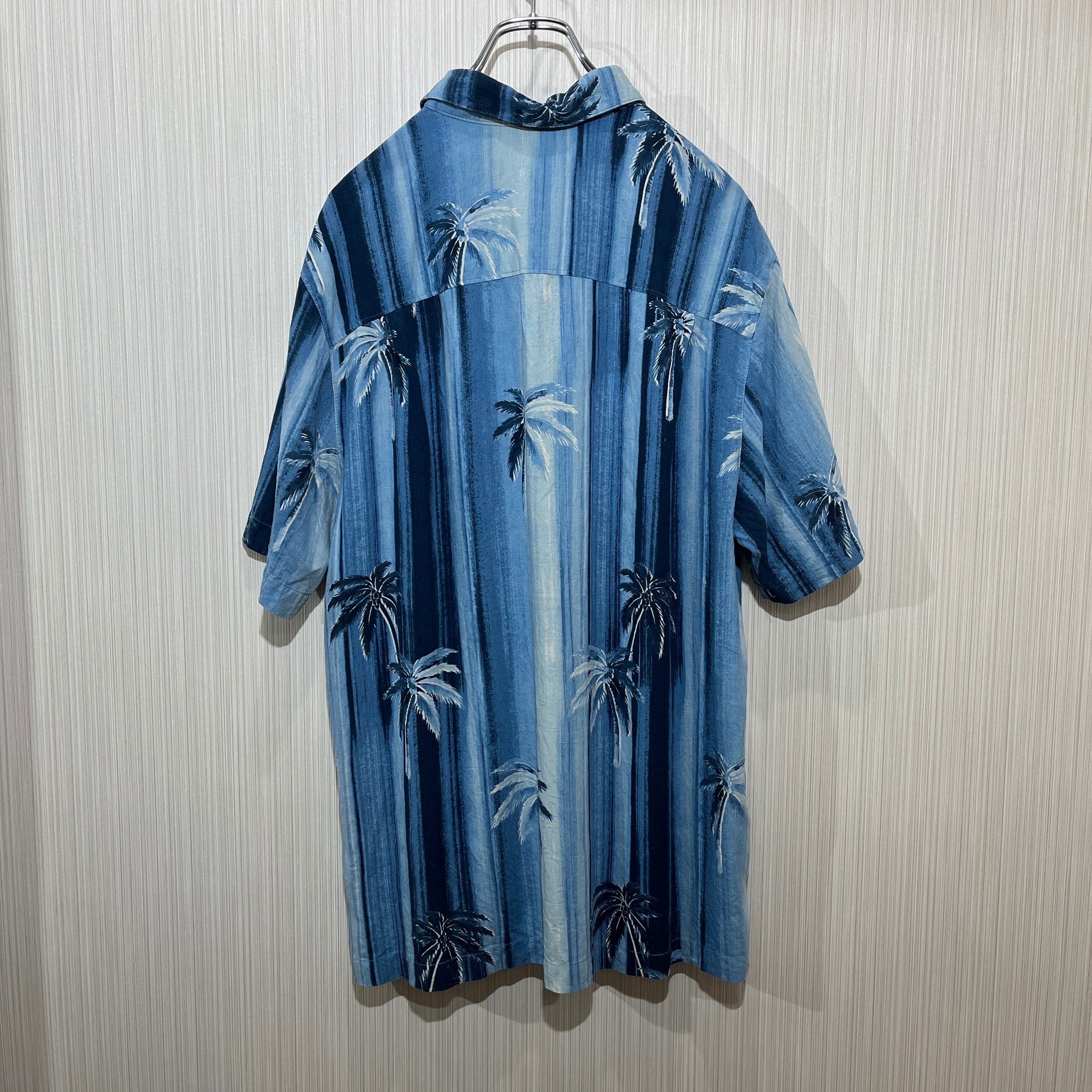 青系のパームツリー柄が特徴的な半袖シャツ。