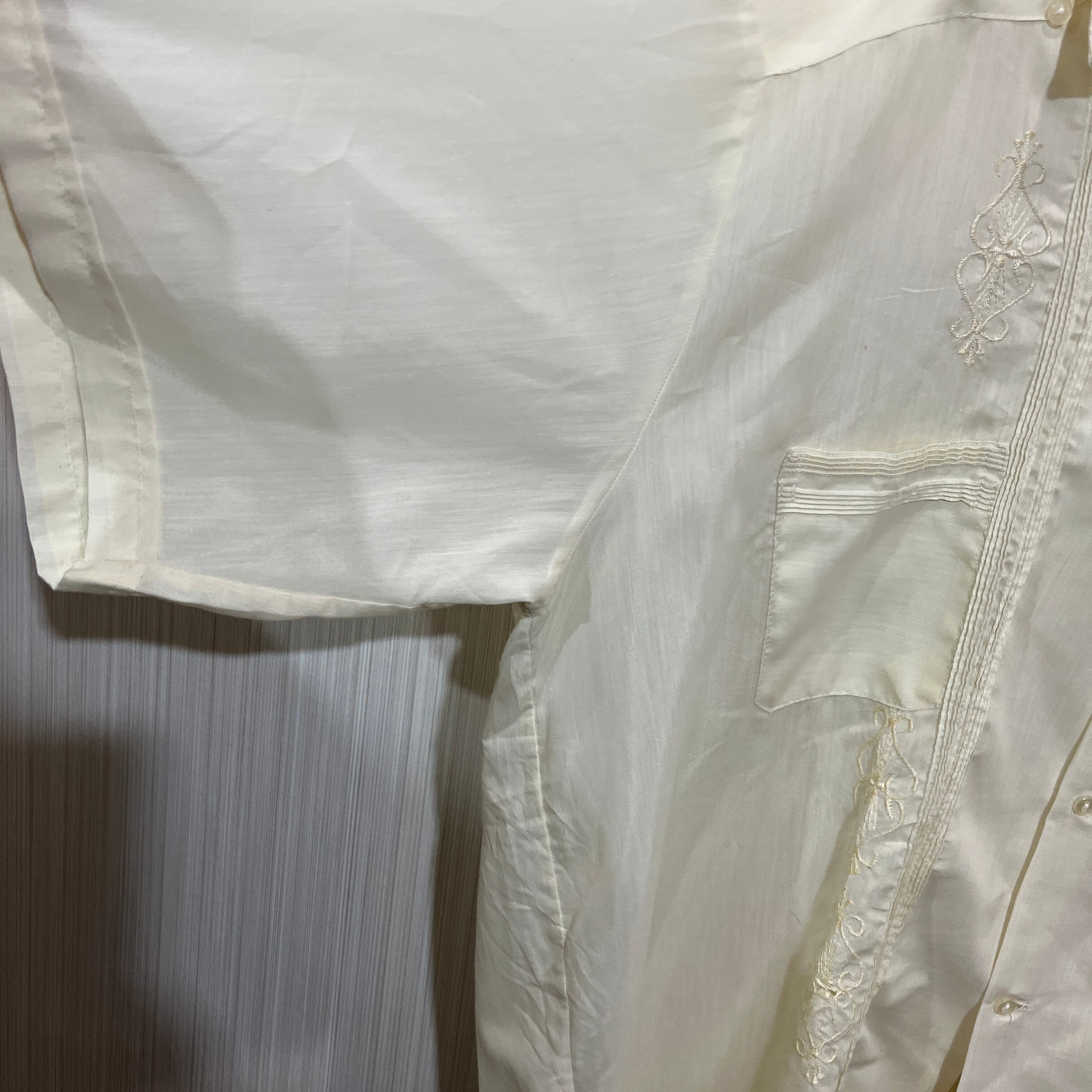 アイボリーの刺繍入りオーバーサイズシャツ、2つのポケット付き。