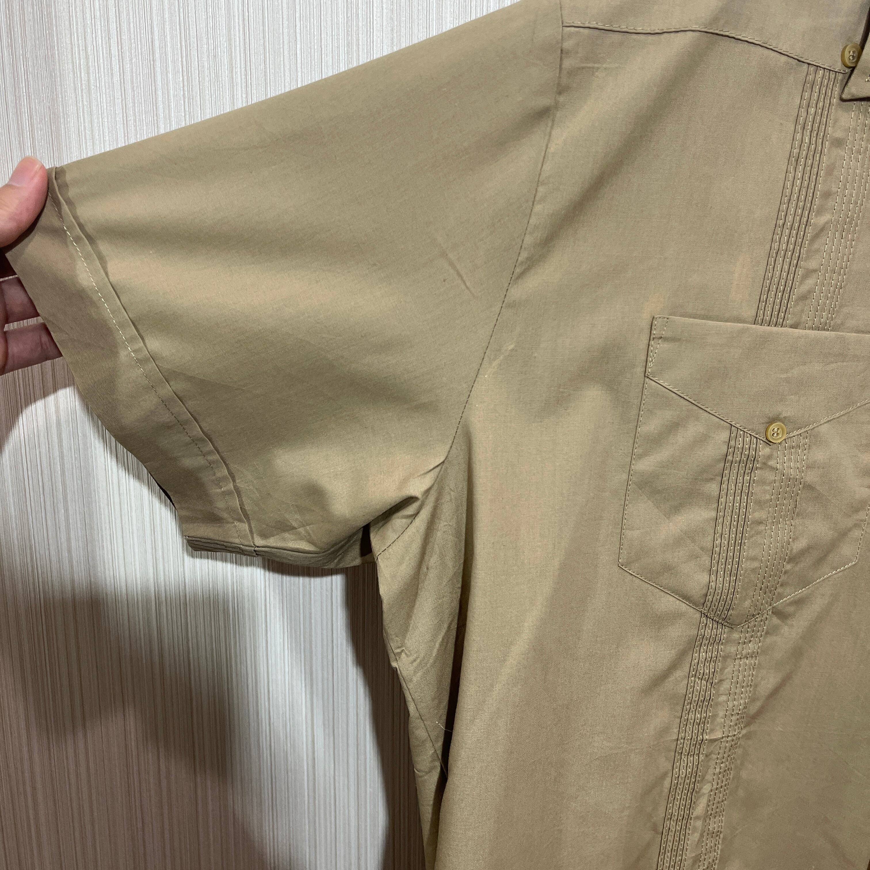 前面に2つのポケットを持つベージュの半袖シャツ、コットン混紡素材で快適な着心地。