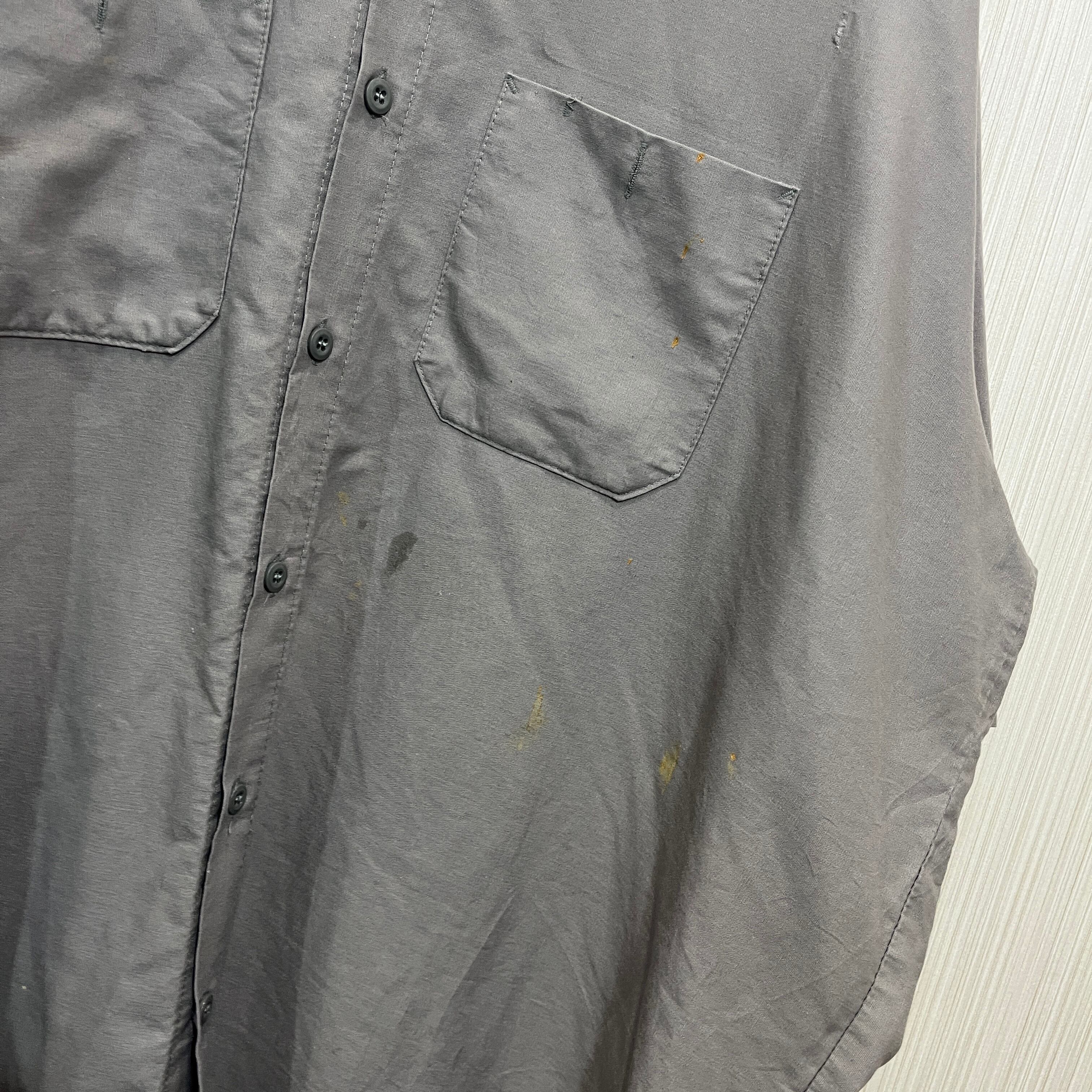 グレーのコットン混紡ワークシャツ、刺繍ネームタグ付き。