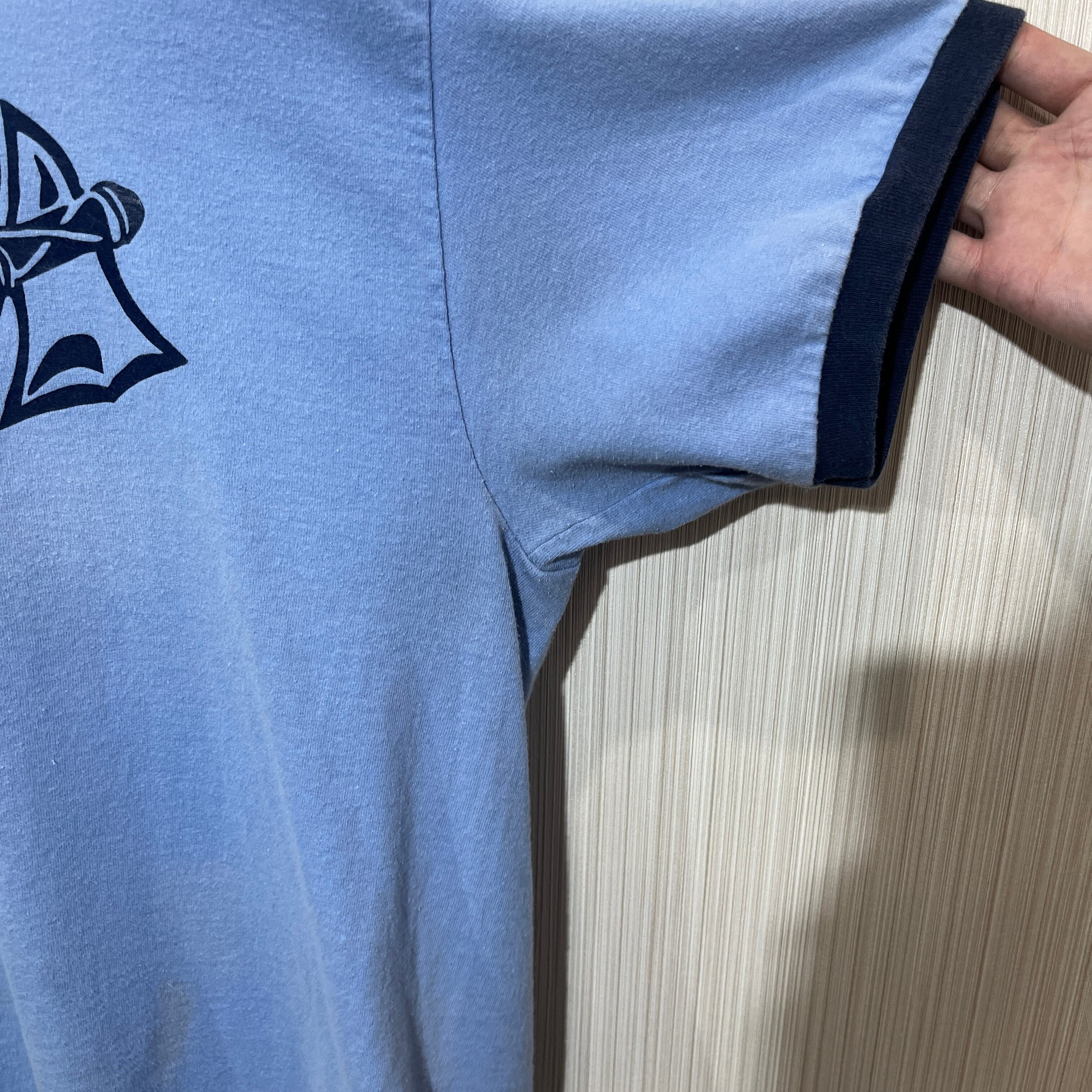 ライトブルーのWarriorsロゴTシャツ、ネイビーのリブ付きでスタイリッシュ。