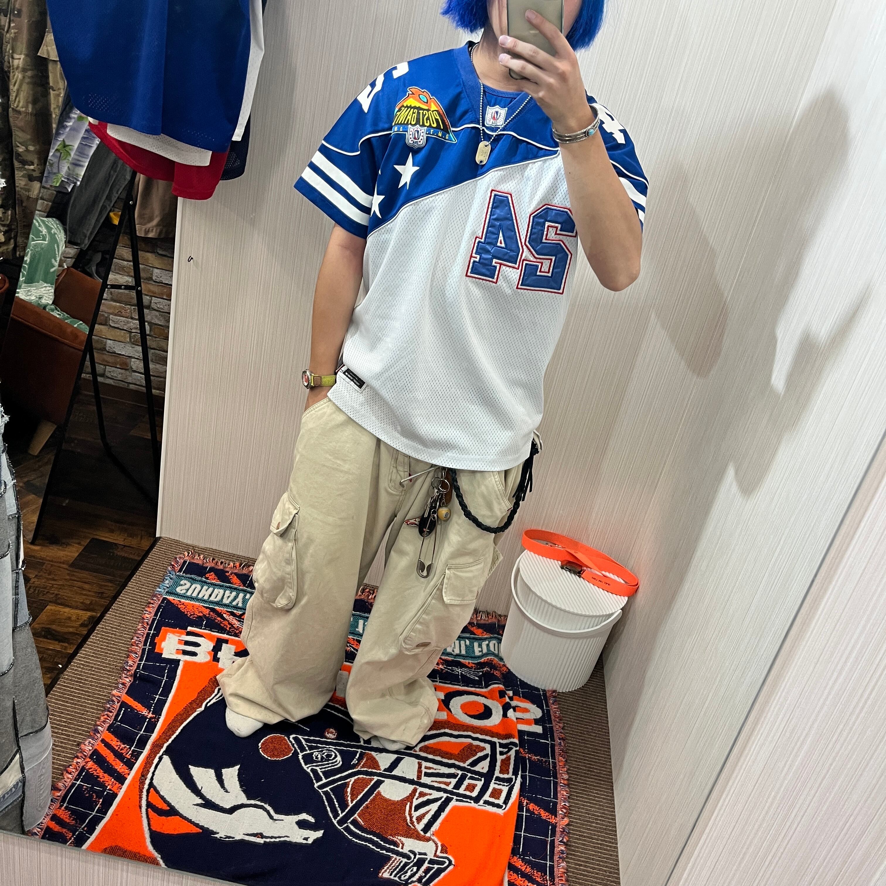 青と白の星モチーフのアメリカンフットボールシャツ、番号24、FIRST GAMEロゴ付き。