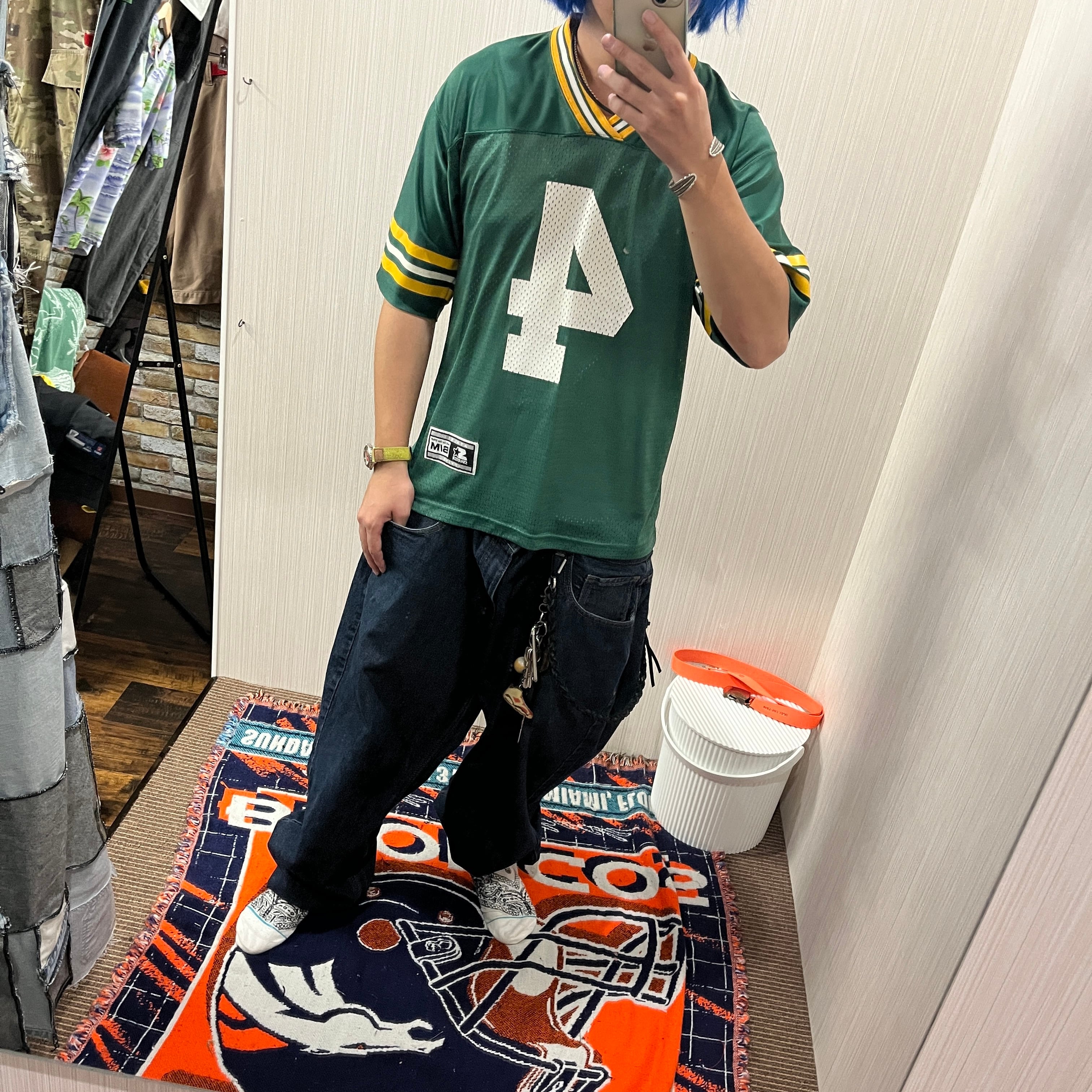 緑色のStarter製アメリカンフットボールシャツ、背面に大きな4の番号が特徴。