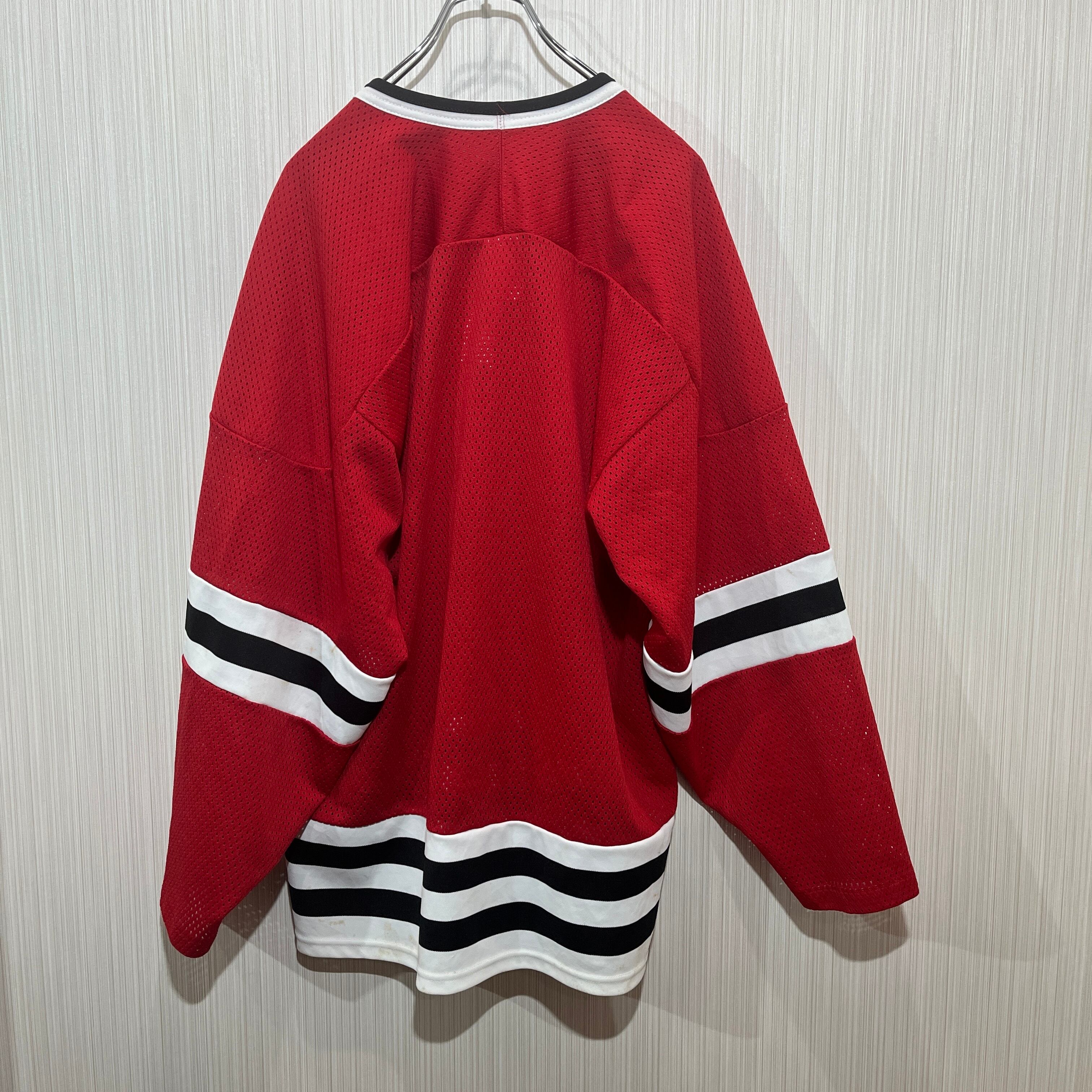 メッシュ素材の赤いアイスホッケーユニフォーム、Vネックデザイン、ストライプ入り。