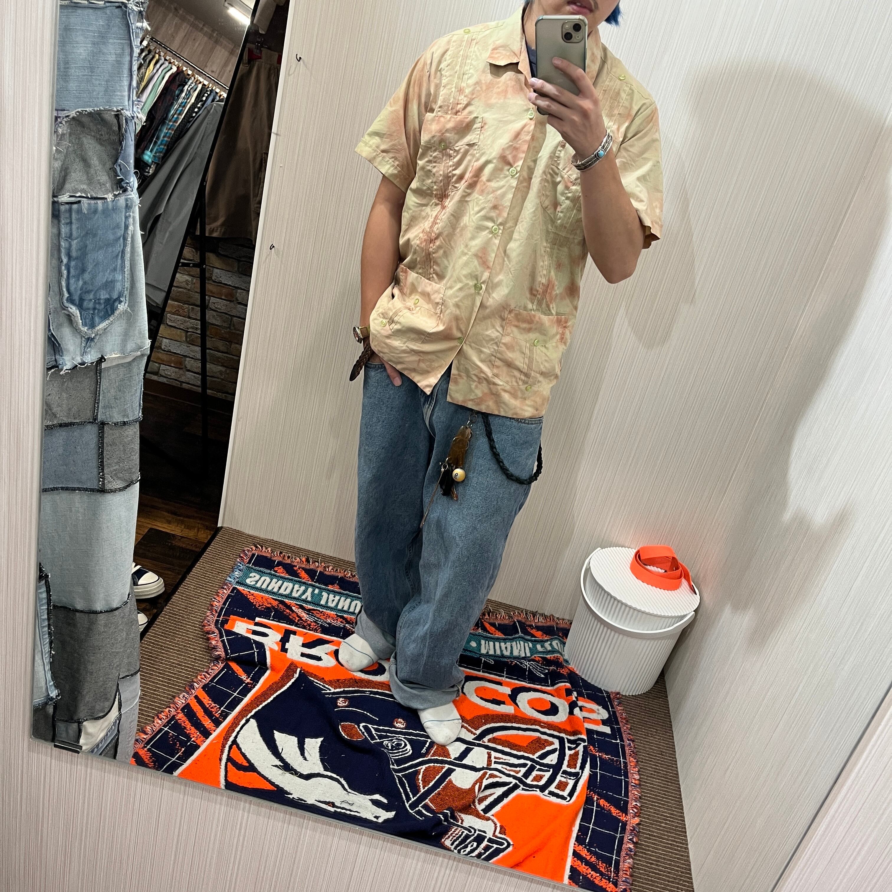 タイダイ風のベージュ半袖シャツ、ボタンアップデザインでカジュアルに最適。