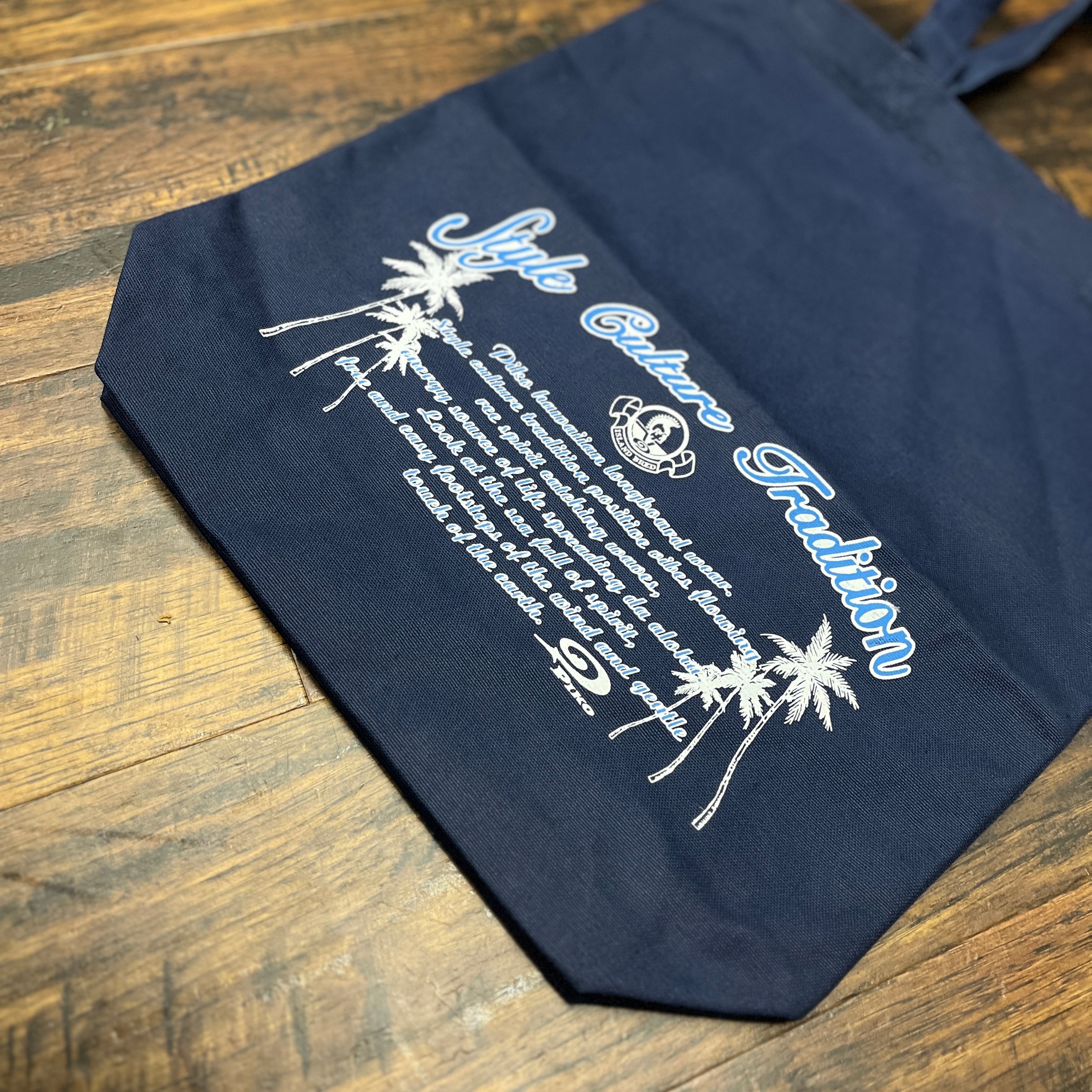 ネイビーのキャンバス素材トートバッグ、パームツリーとテキストのプリントデザインが特徴。