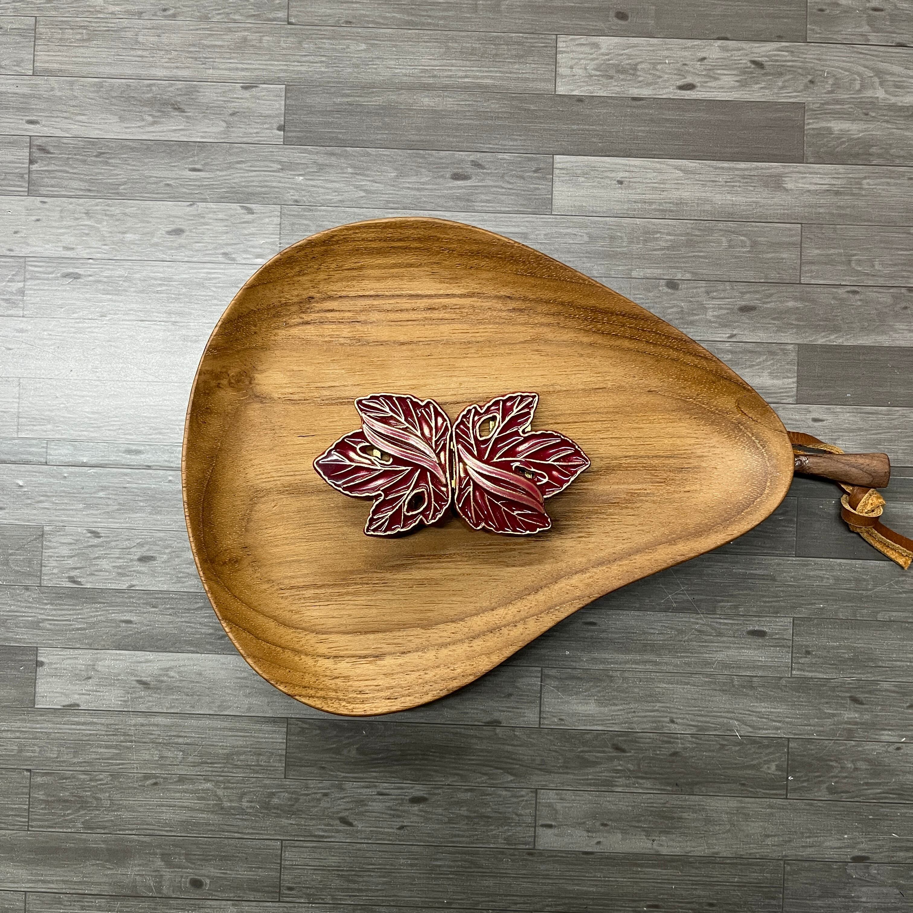 葉っぱ型の赤と金のクリップ、金属製で約6cm x 5cmのサイズ。
