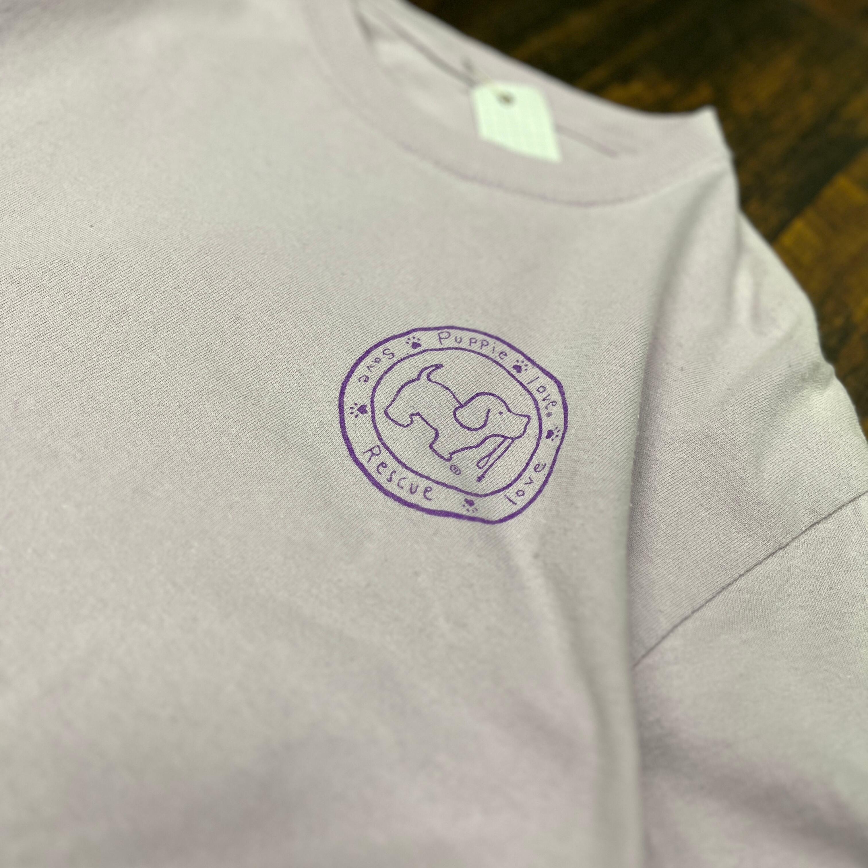 薄紫色のコットン製半袖Tシャツ、犬のロゴプリント付き。