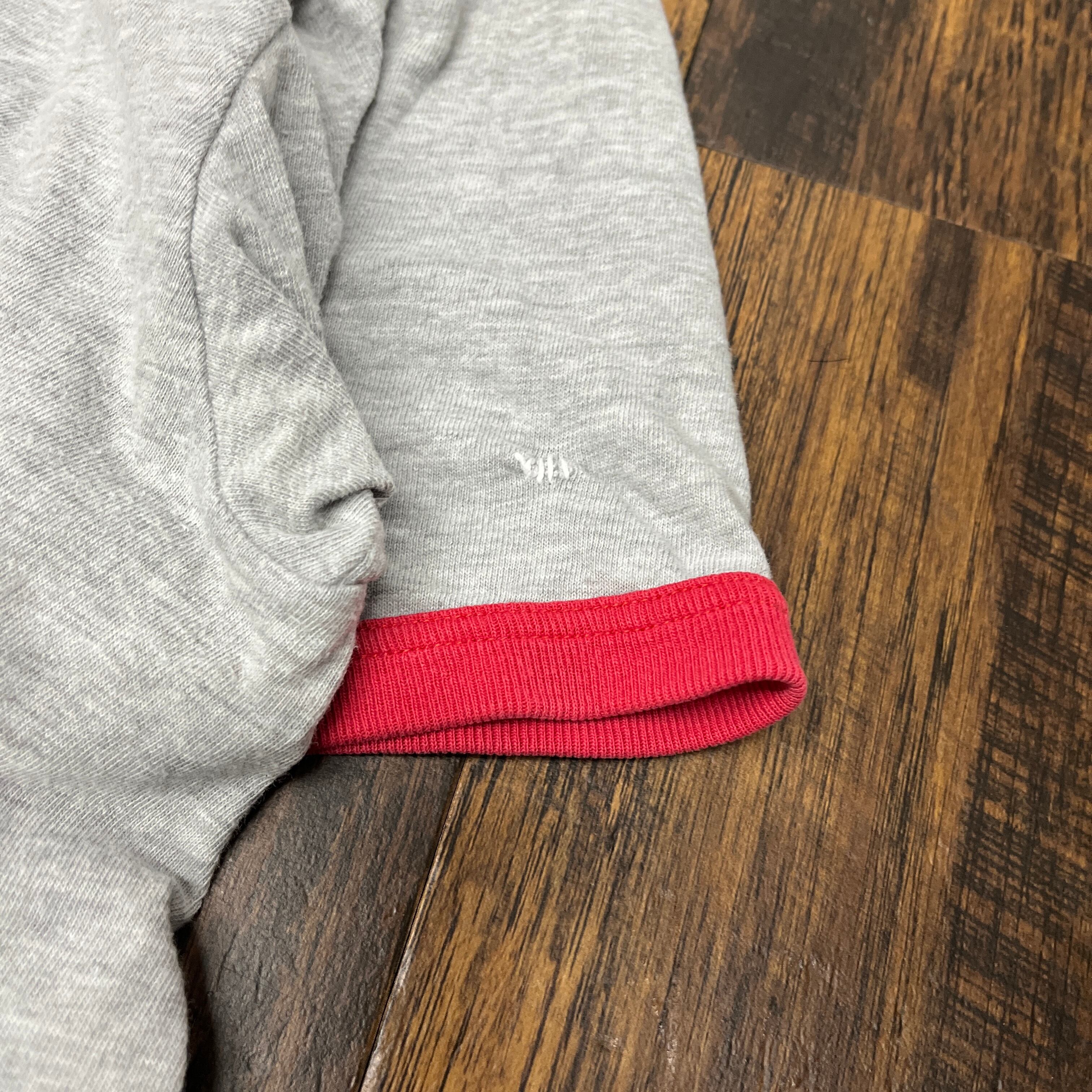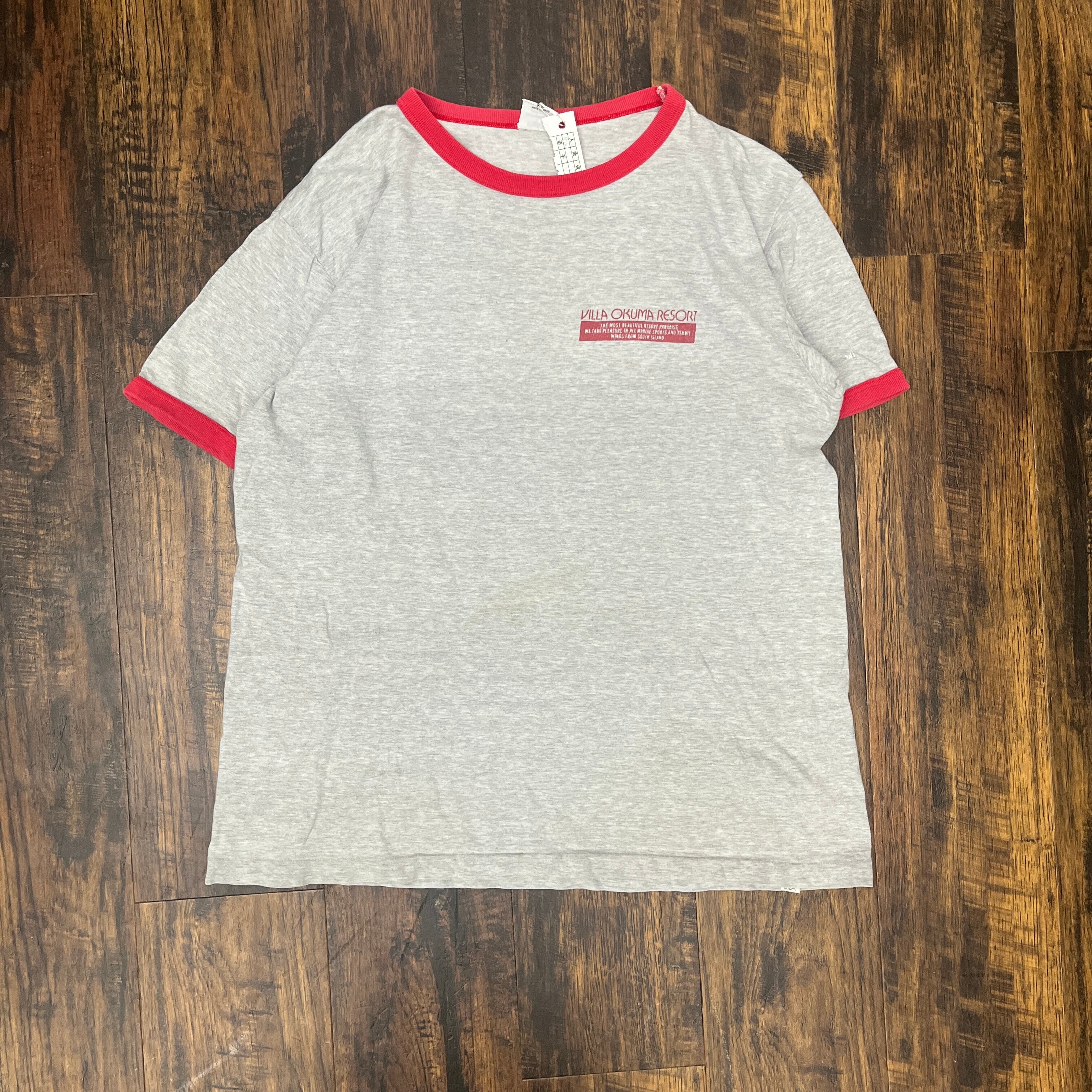 グレーのTシャツ、赤いリブ付き、VILLA OKUMA RESORT!のプリントデザイン。