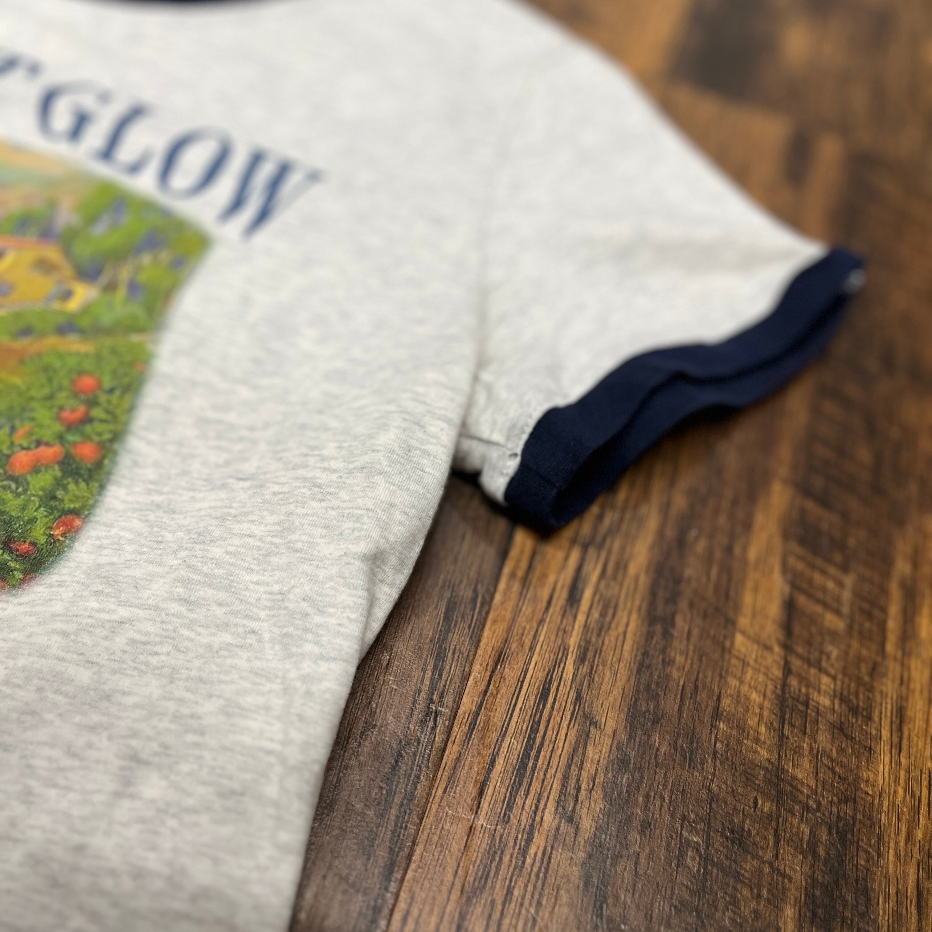 グレーとネイビーの配色で、風景を描いたグラフィックプリントのTシャツ。