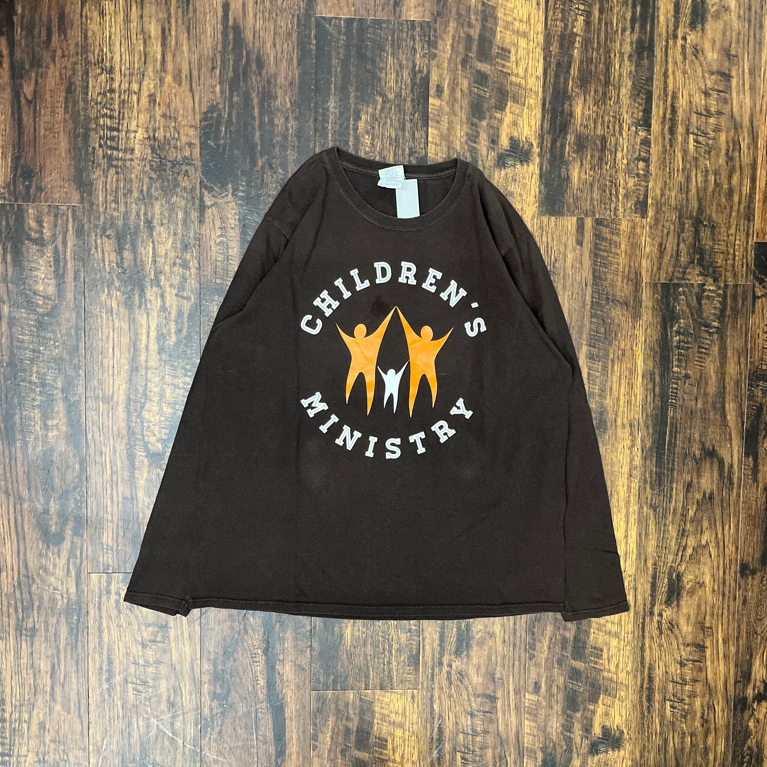 子供のミニストリーのプリントが施された黒のロングスリーブTシャツ。
