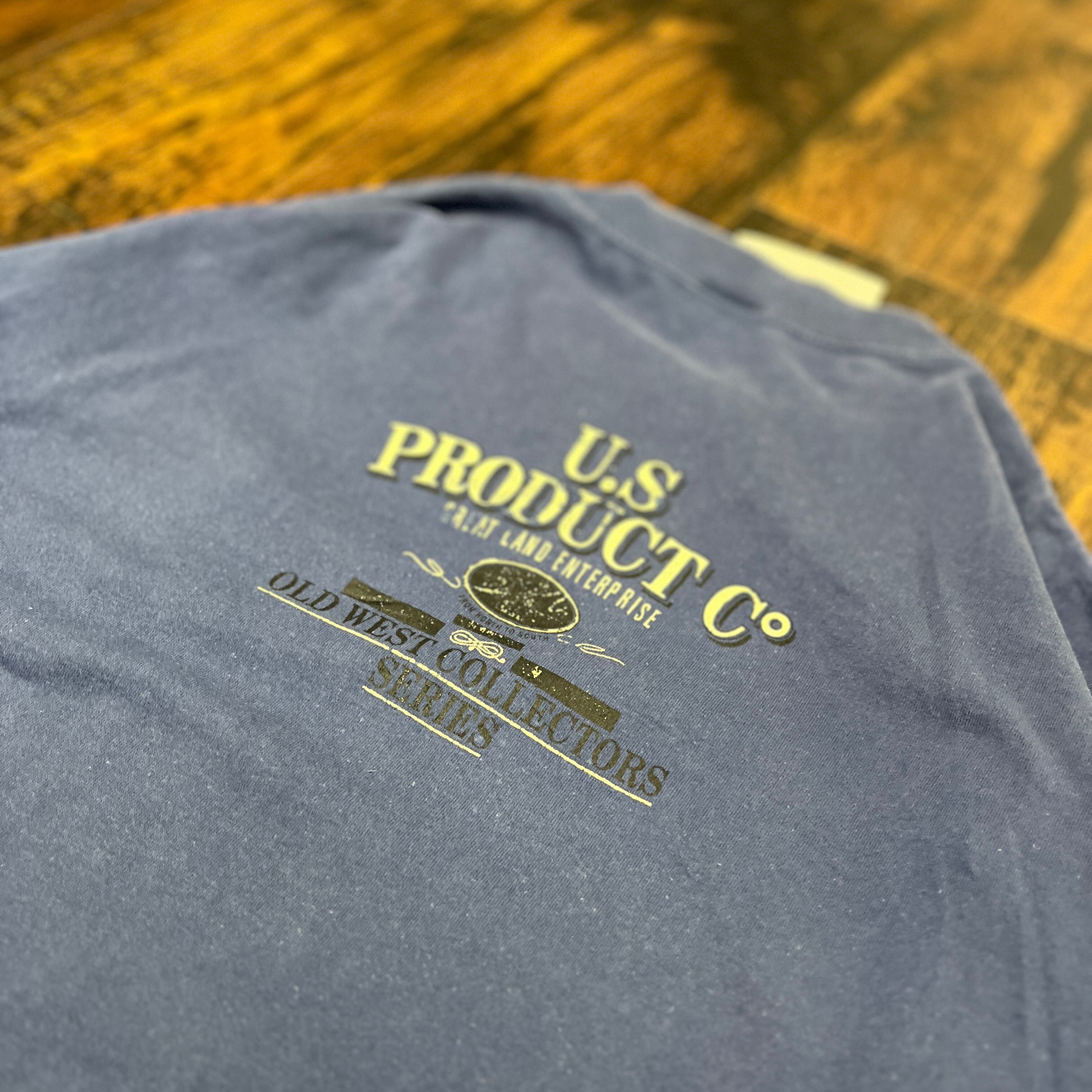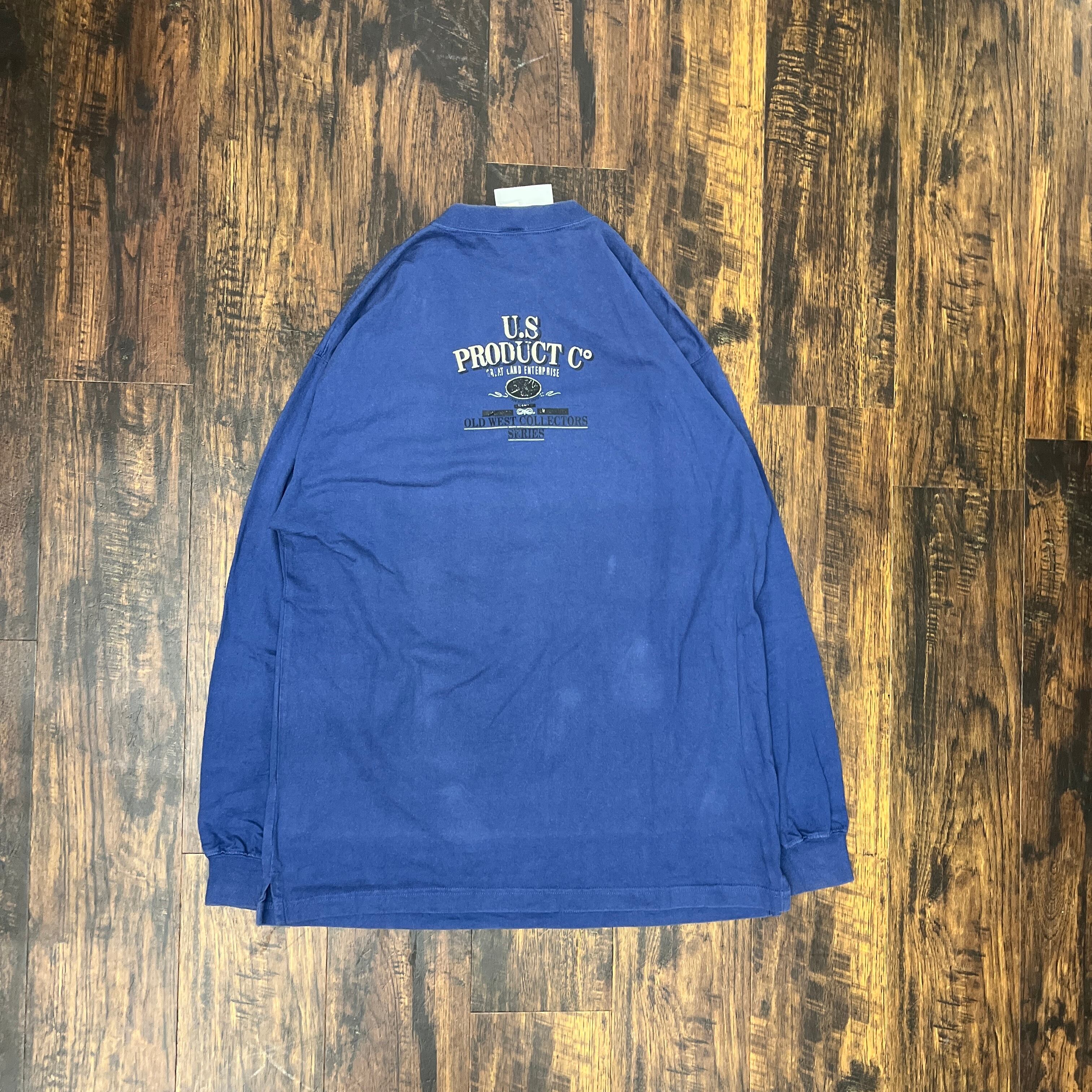 ネイビーのロングスリーブカットソー、プリントデザイン付き。