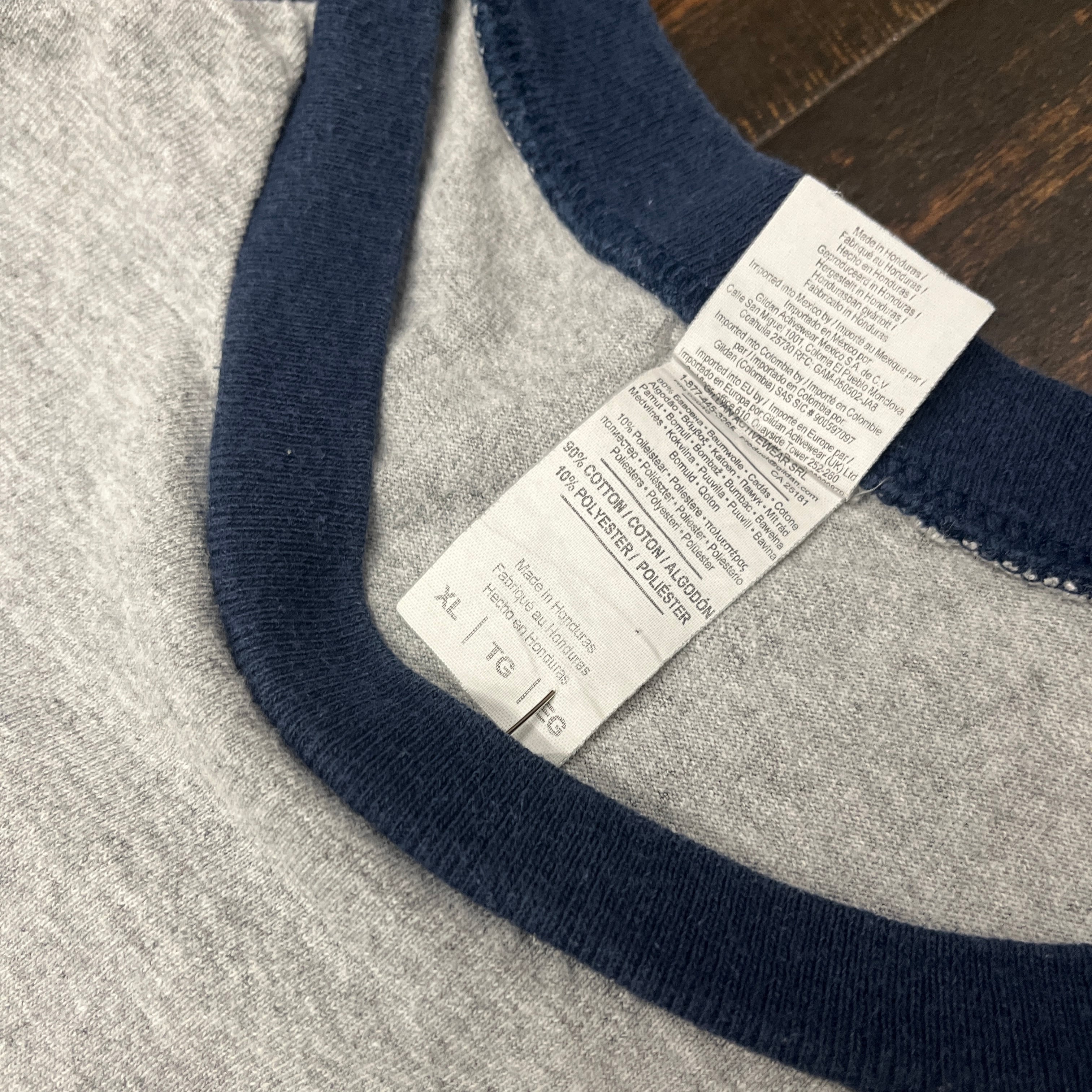 グレーとネイビーのラグランスリーブTシャツ、柔らかいコットン混紡素材。