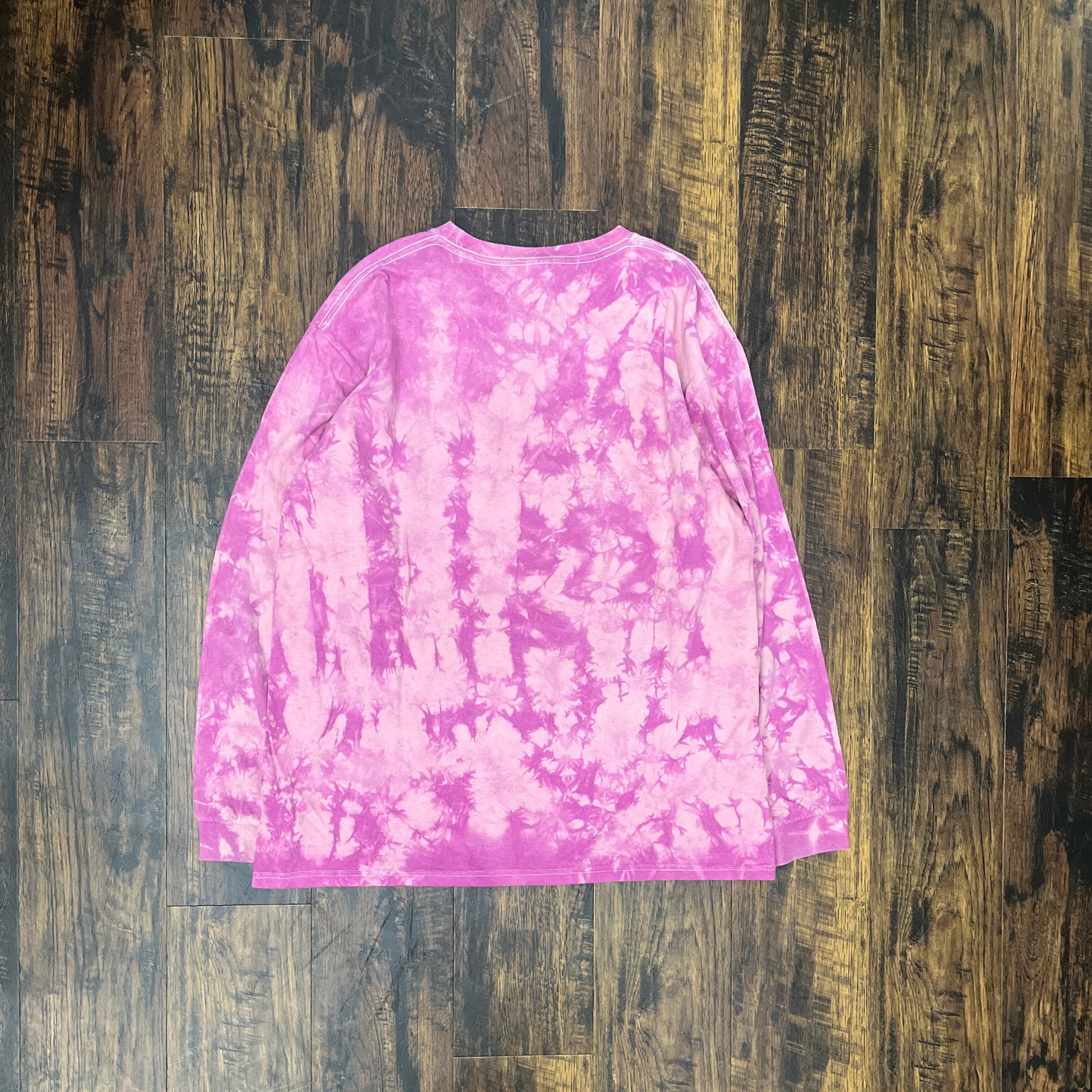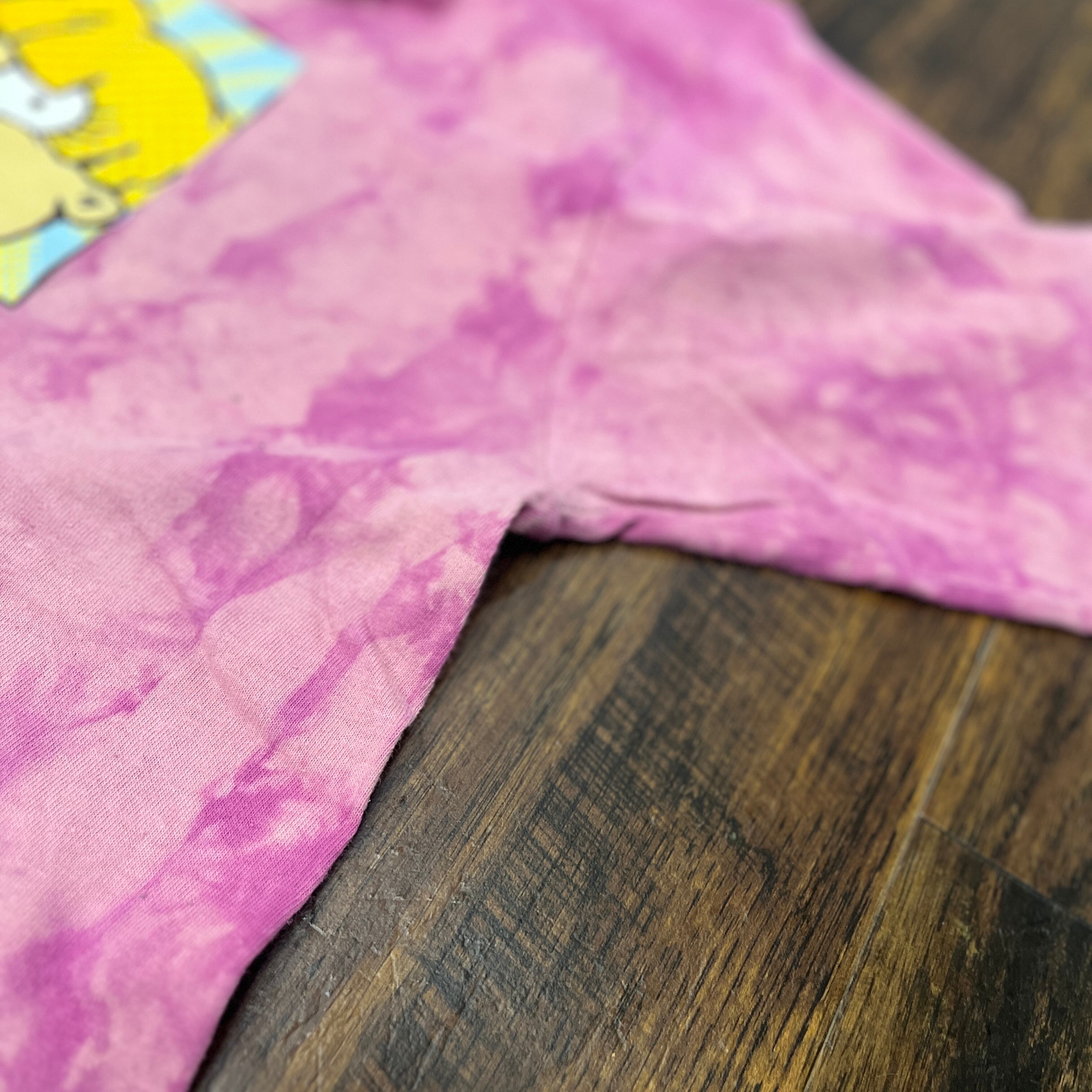 タイダイデザインのピンクTシャツ、キャラクターグラフィック付き。
