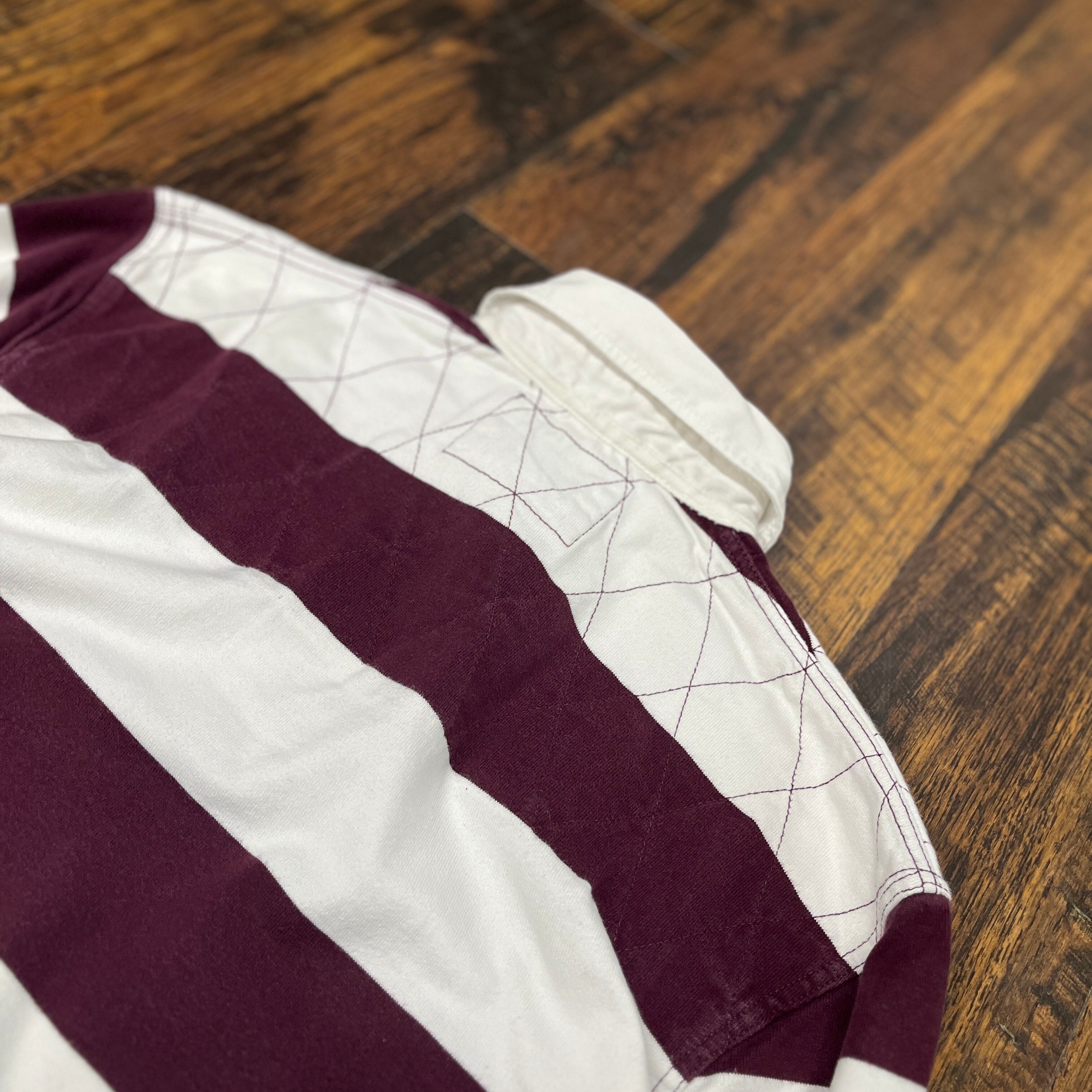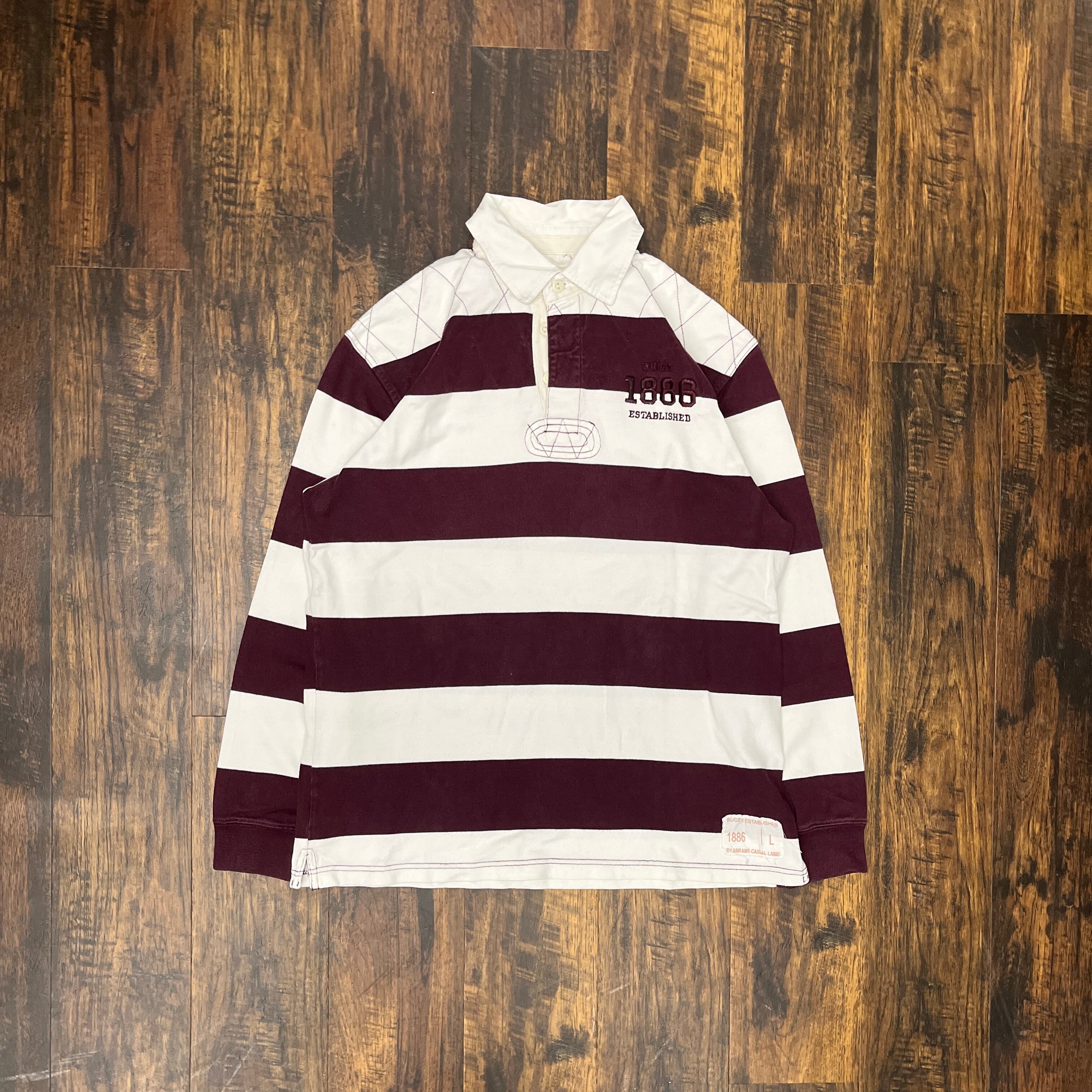 ボルドーとホワイトのストライプデザインのコットンポロシャツ。