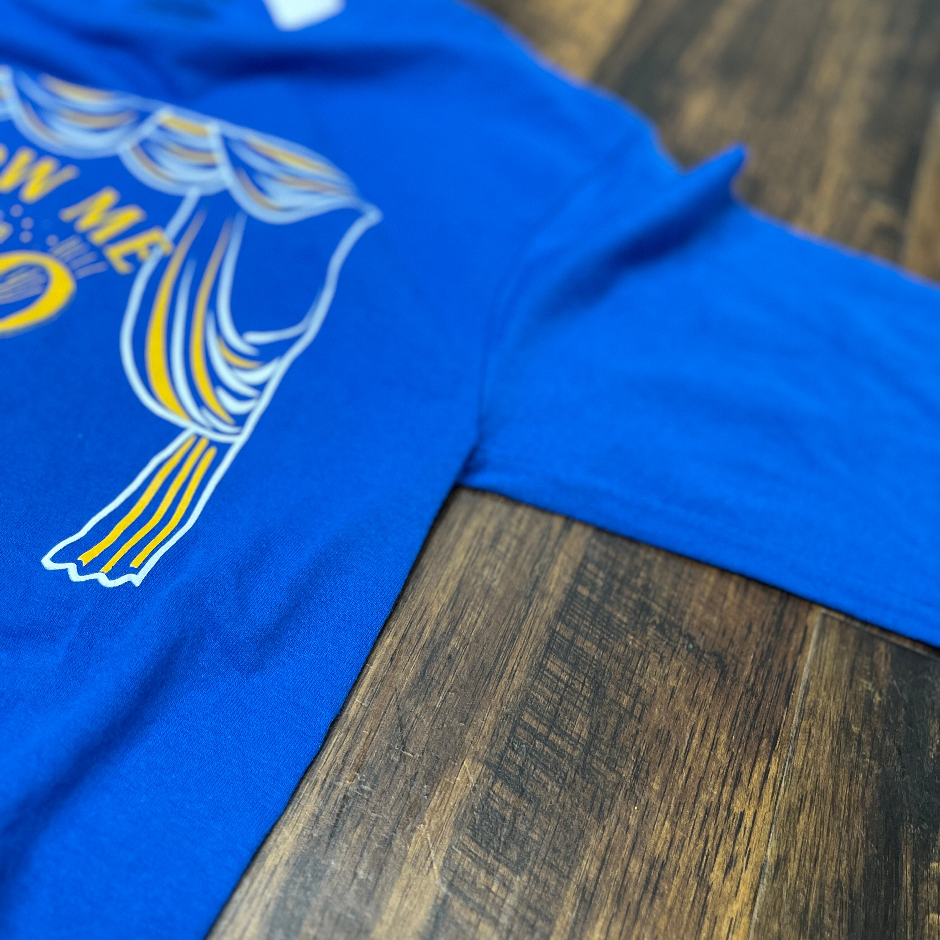 鮮やかな青色のGILDAN製ロングスリーブTシャツ、プリントデザイン付き。