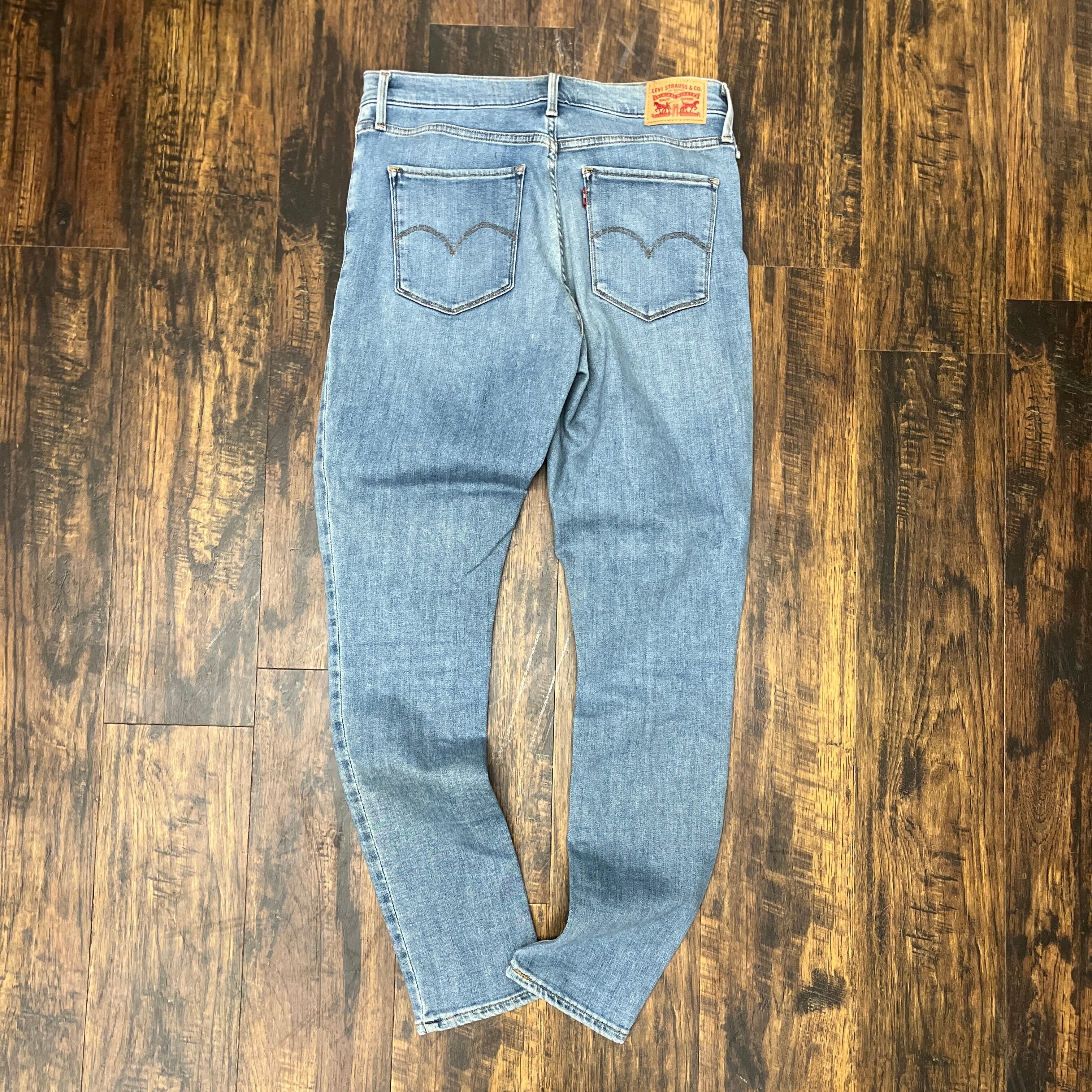 膝部分にダメージがあるライトブルーのスキニーデニム。