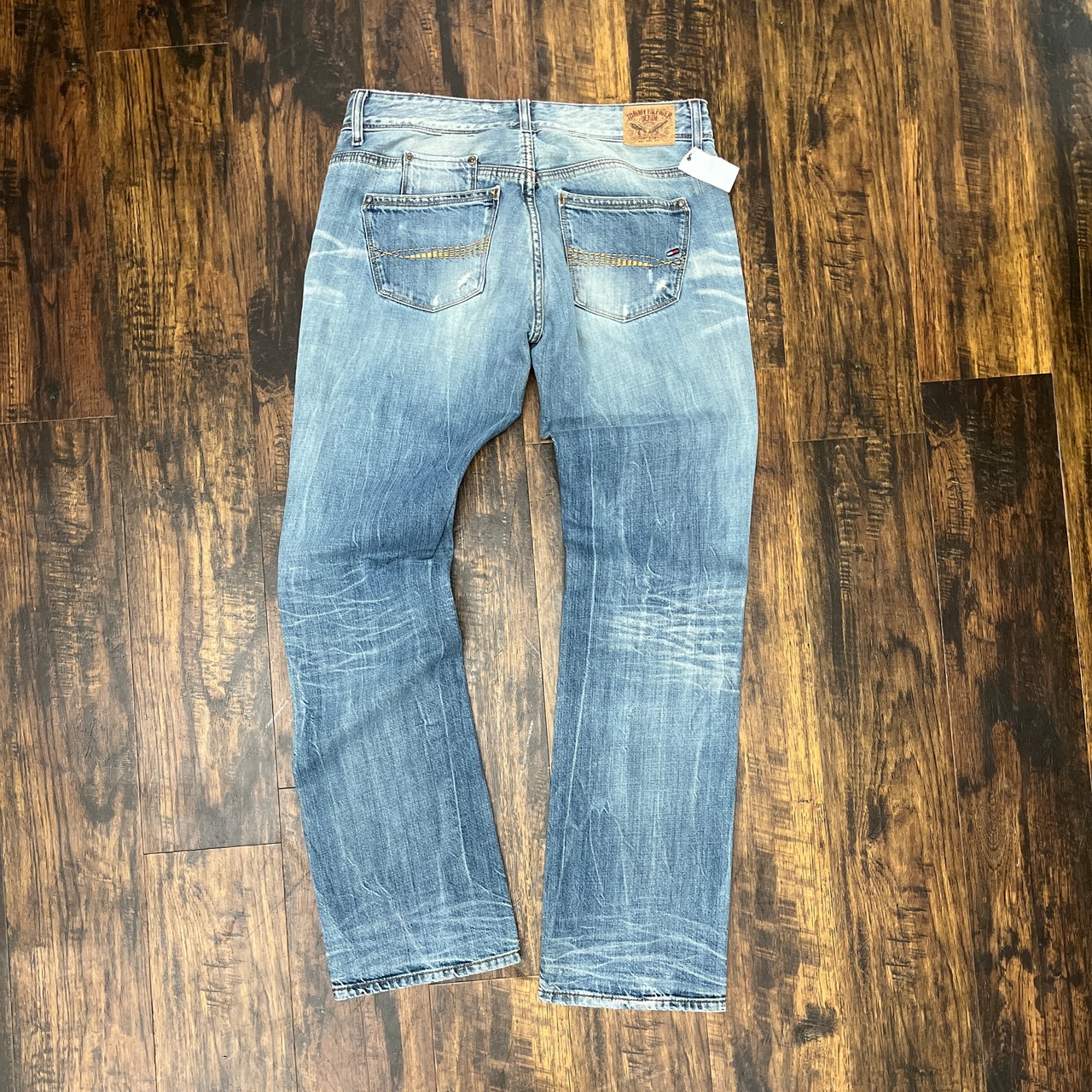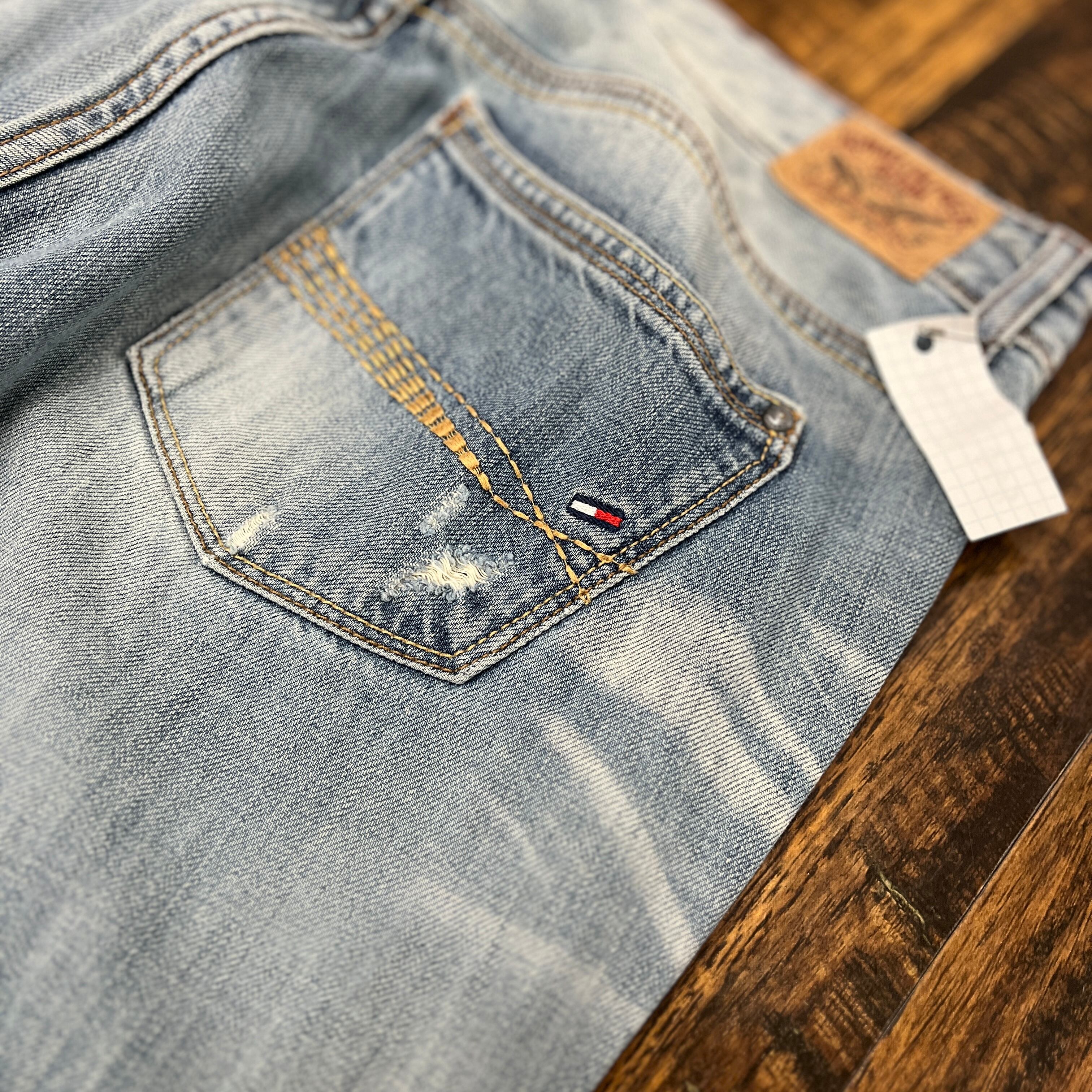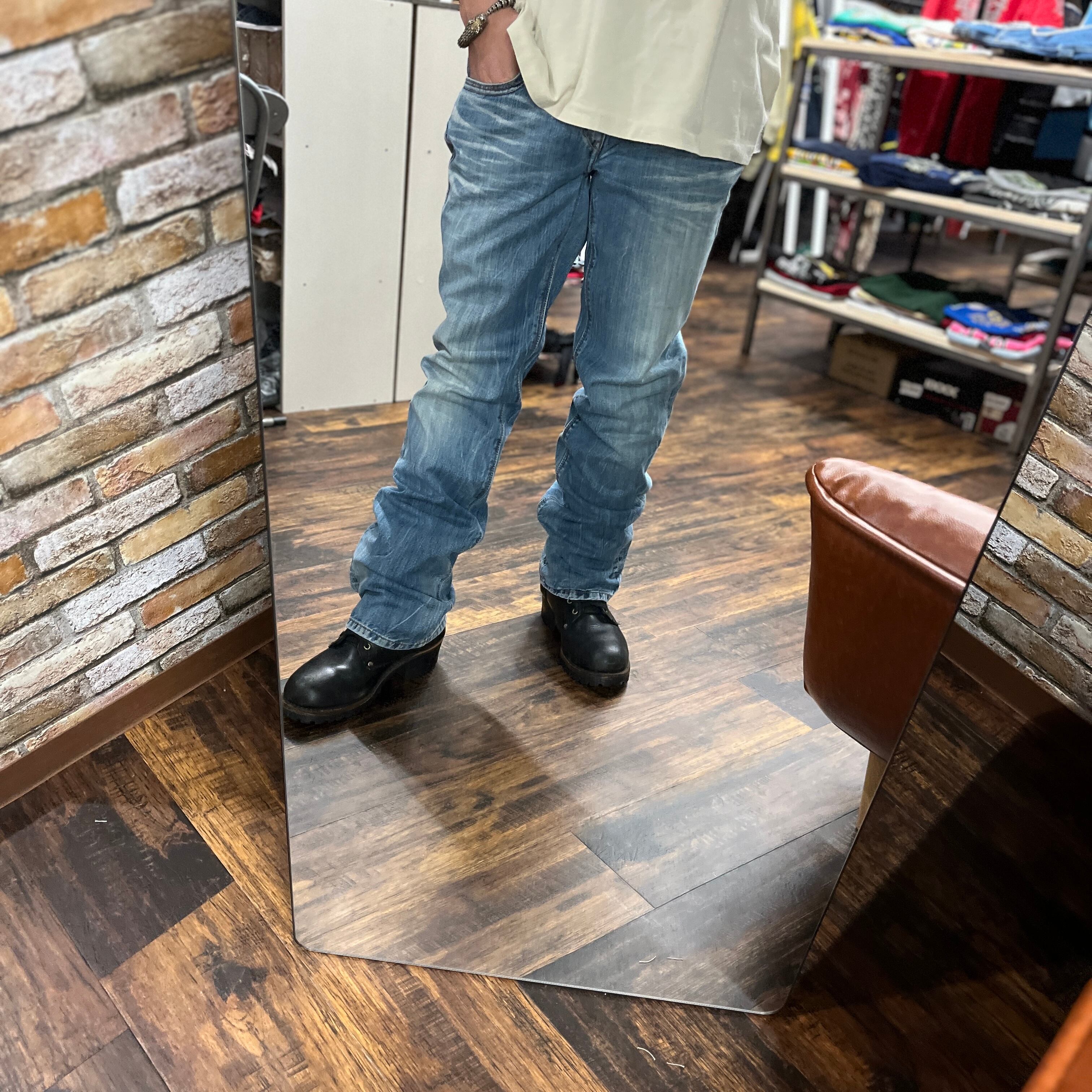 フェード加工が施されたライトブルーデニム、ストレートスタイル。