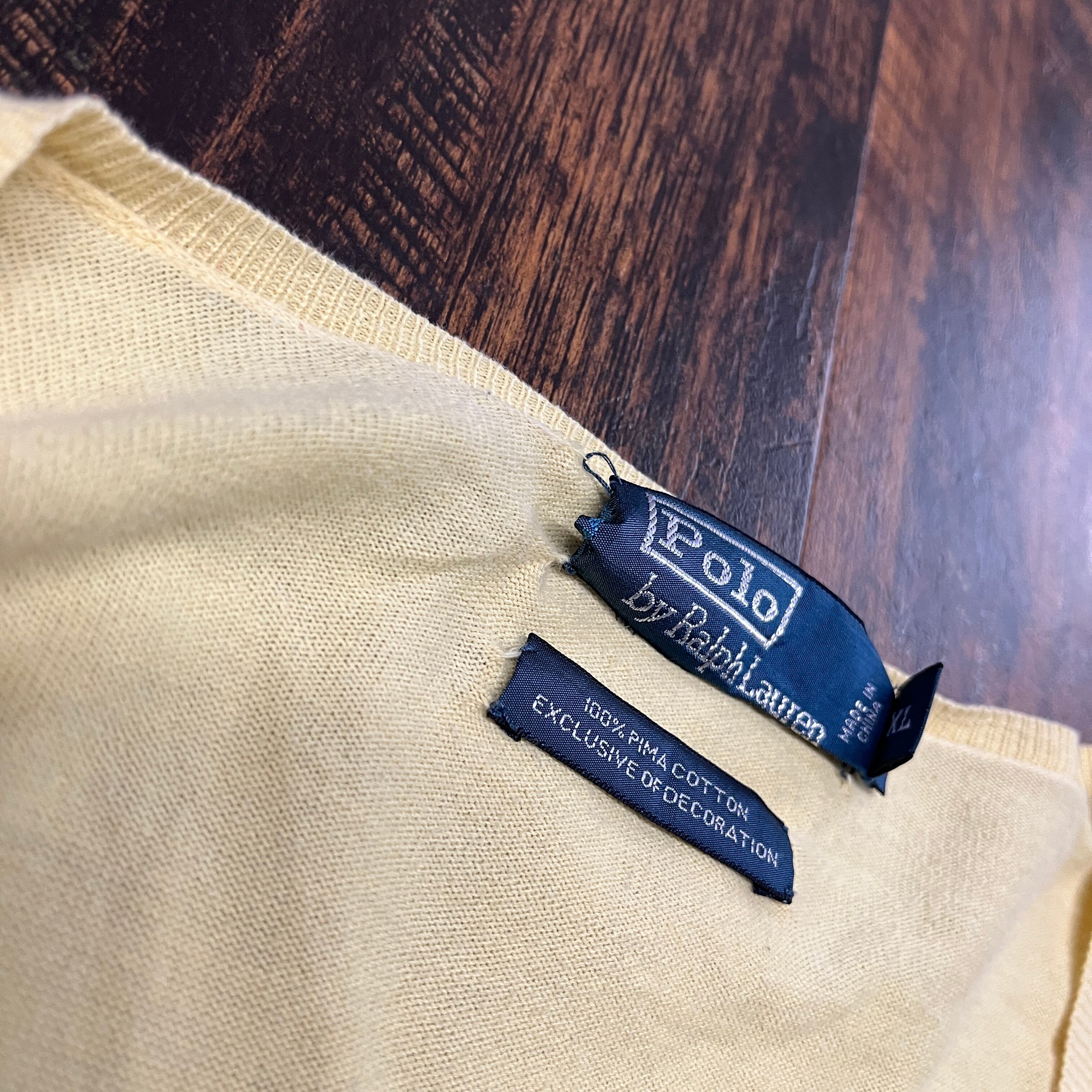イエローのVネックニットセーター、ポロの刺繍入りでカジュアルなスタイルに最適。