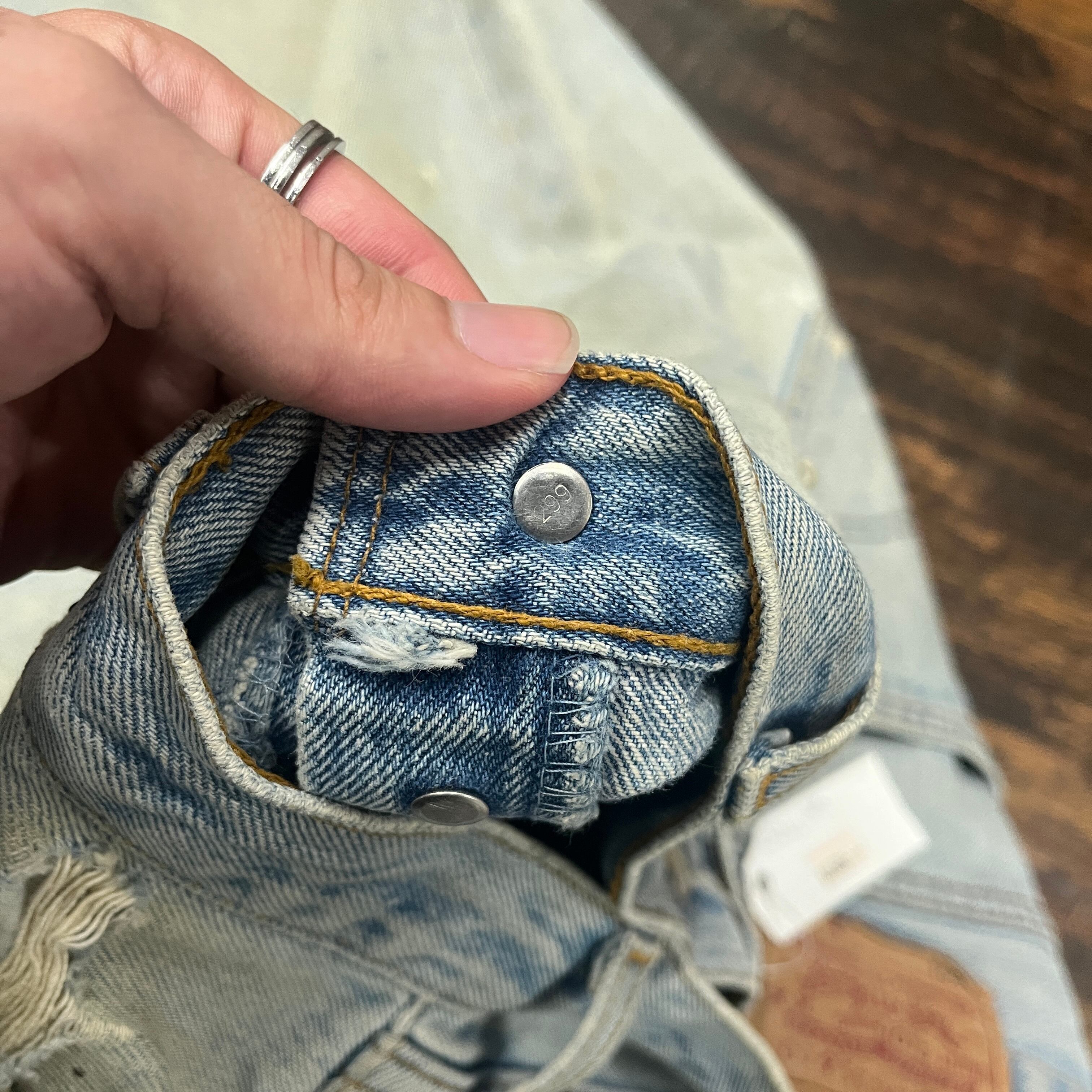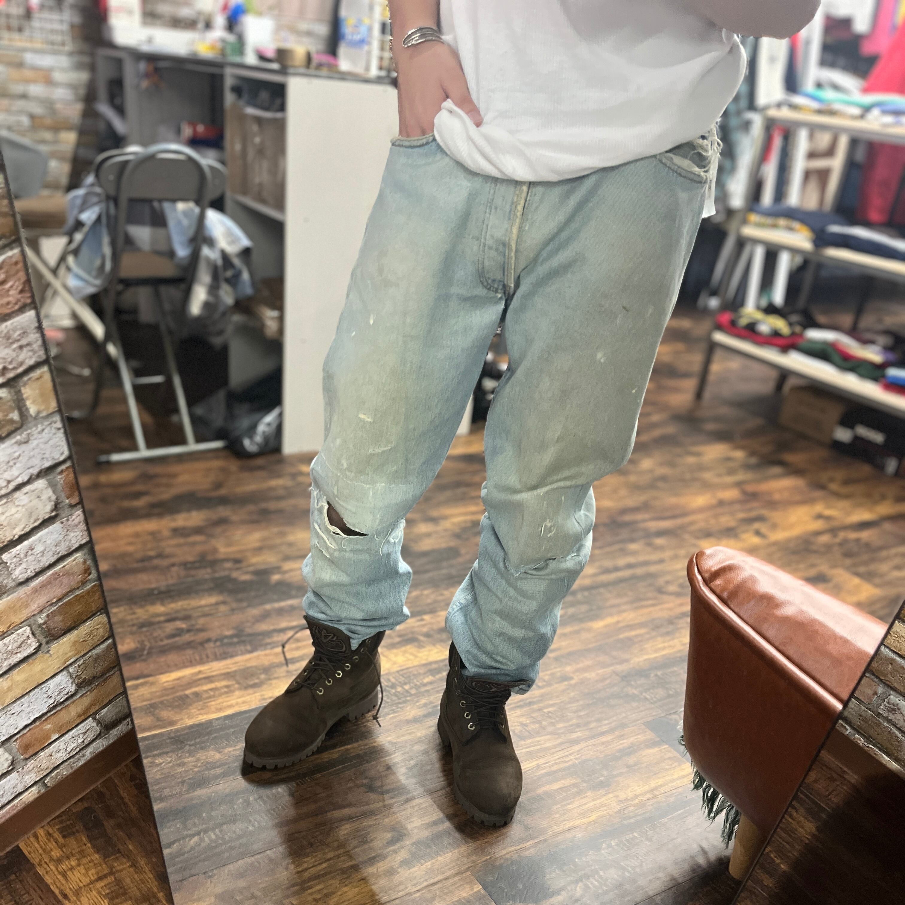 ライトブルーのストレートデニム、ダメージ加工あり。