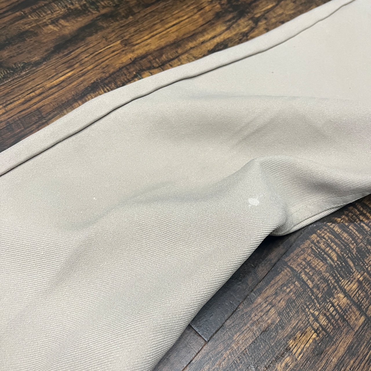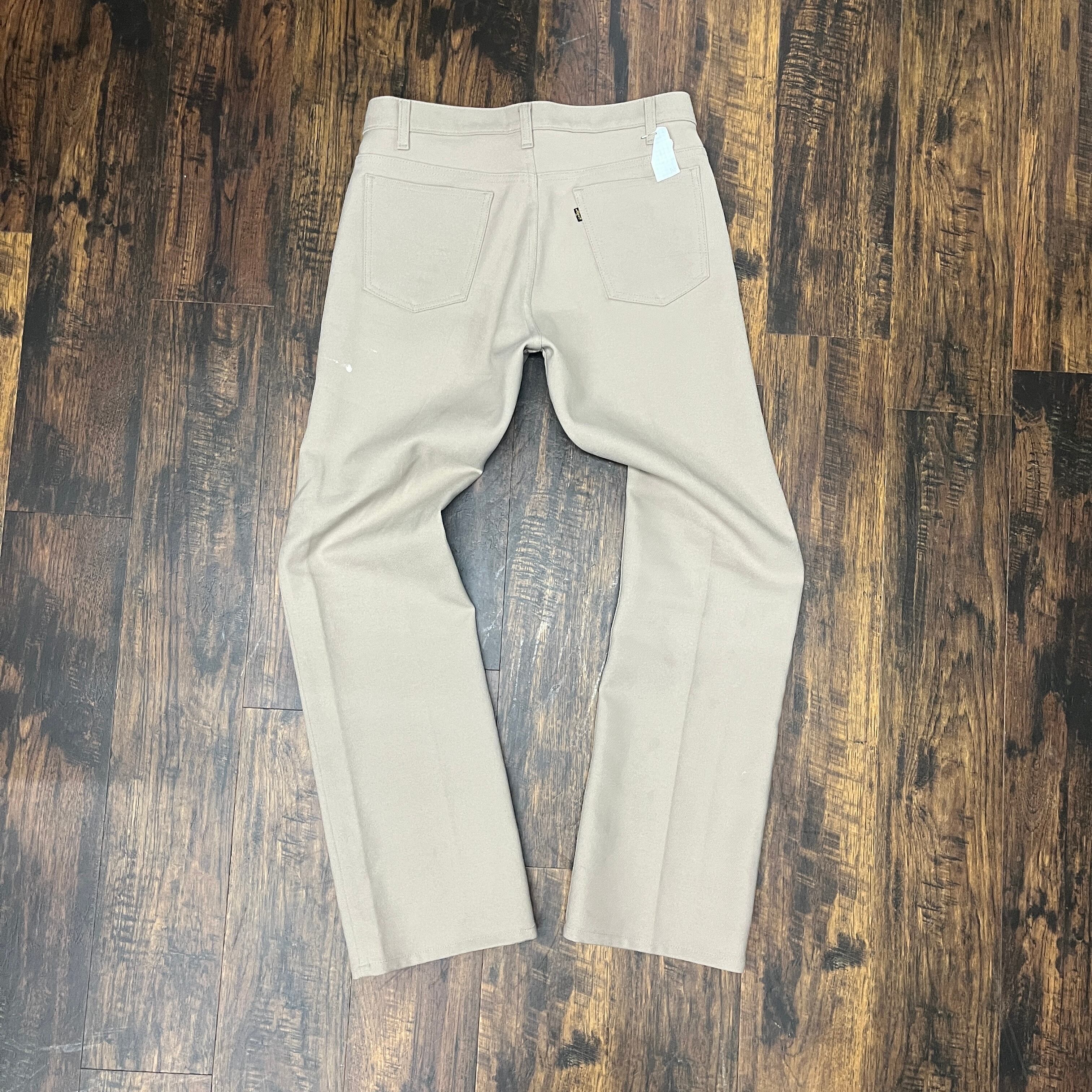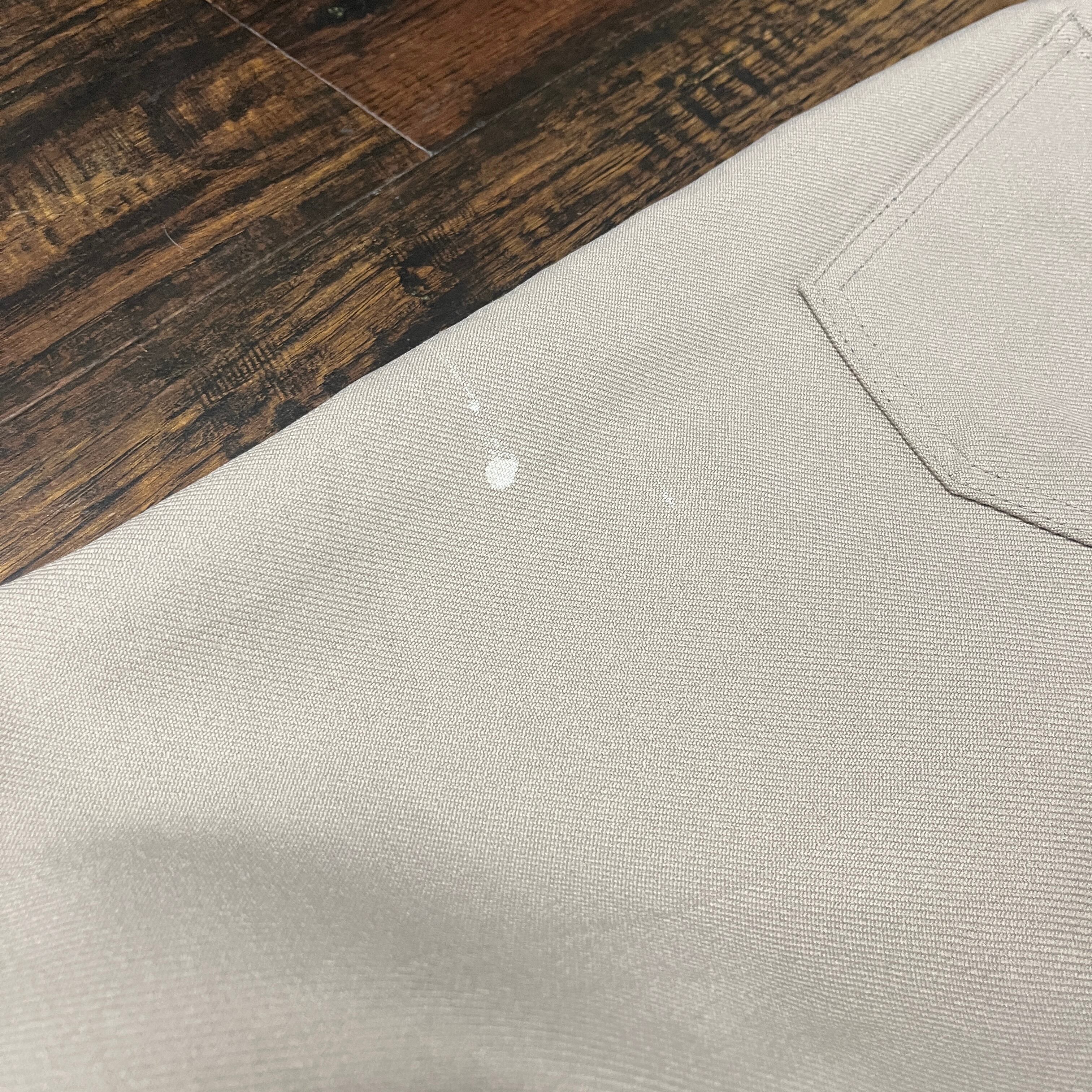 ベージュのストレートレッグスラックス、ペイントの跡が特徴的で、カジュアルなスタイルに最適。