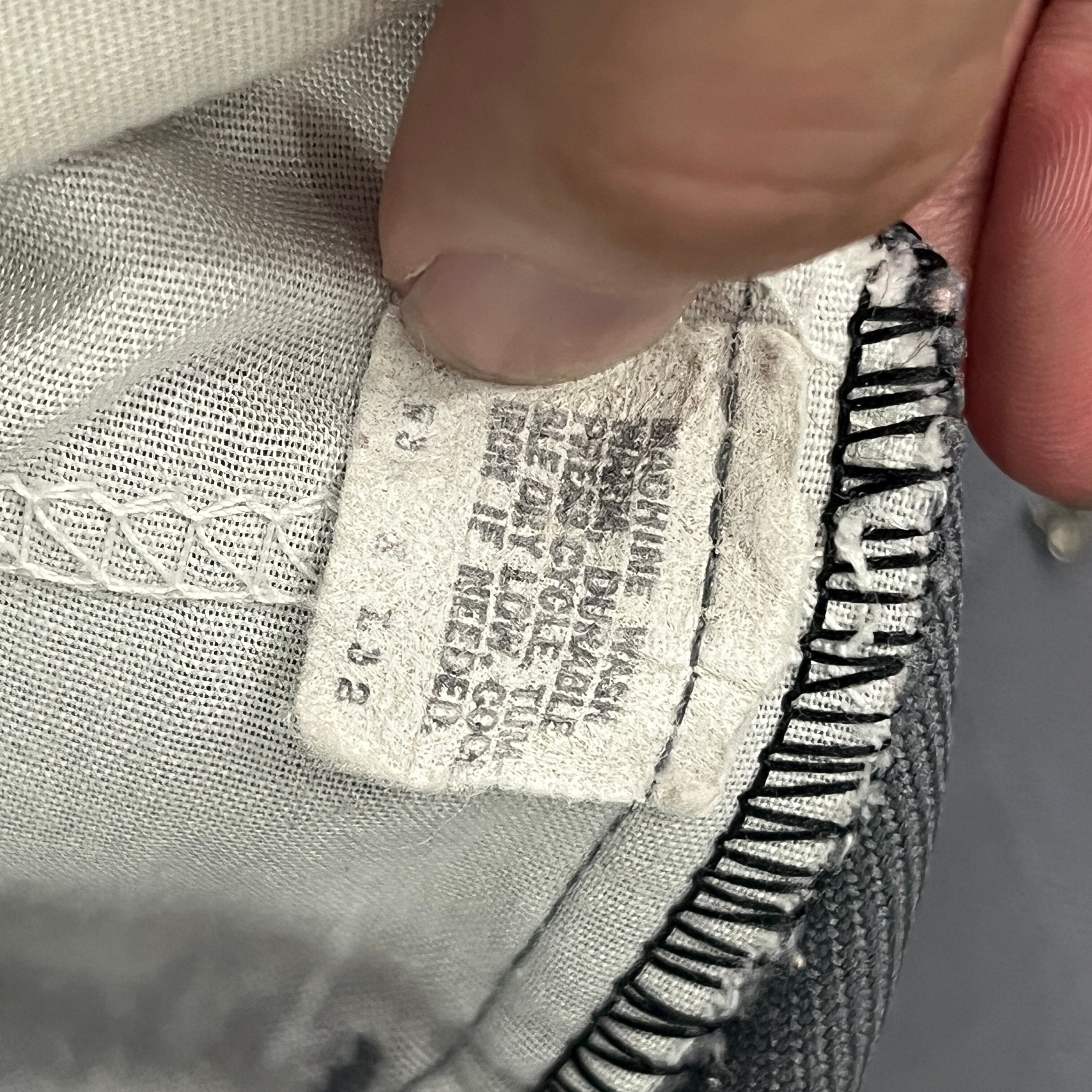 シンプルなグレーのスラックス、ボタン付きウエストデザイン。