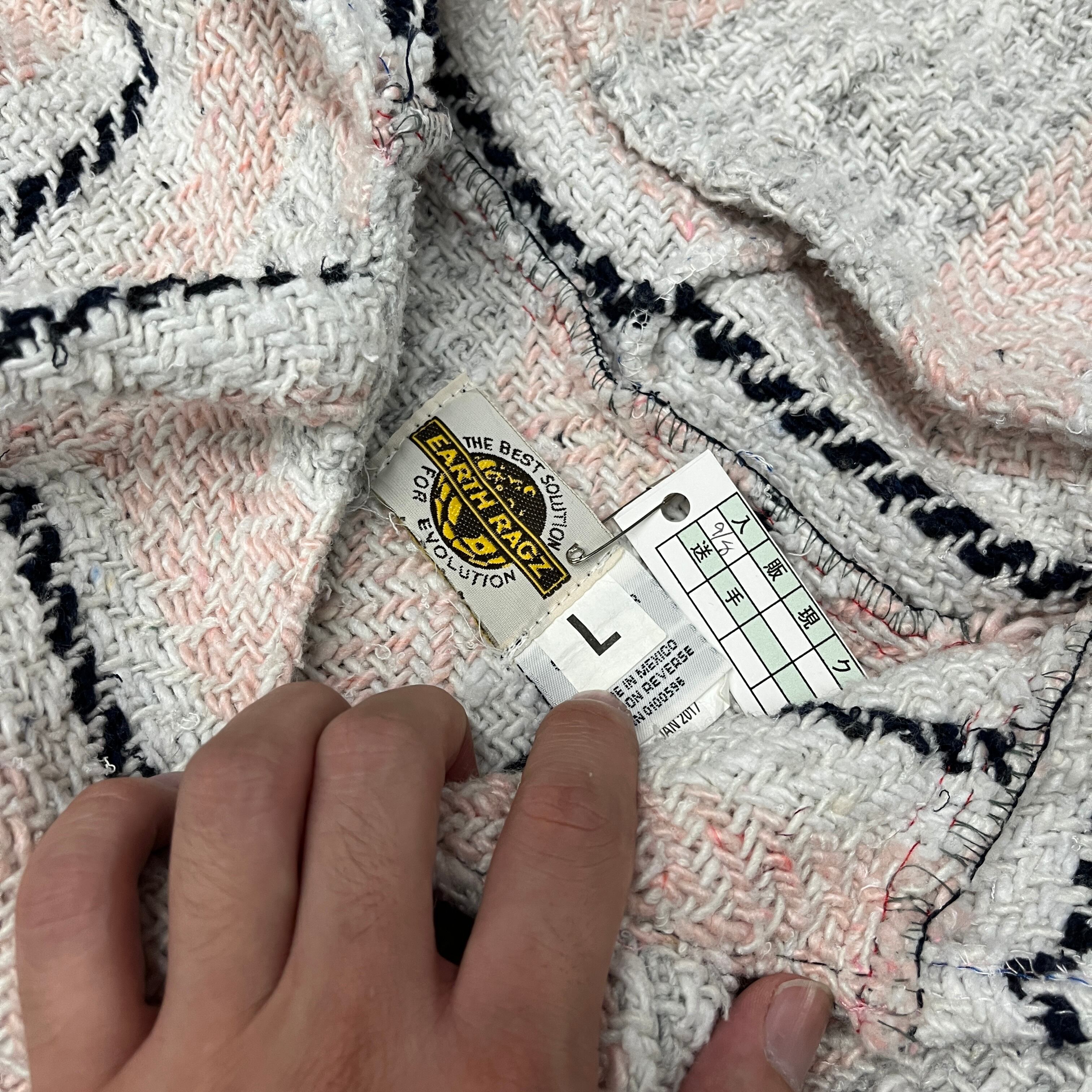 テクスチャーのあるピンクとホワイトのストライプのフード付きパーカー。