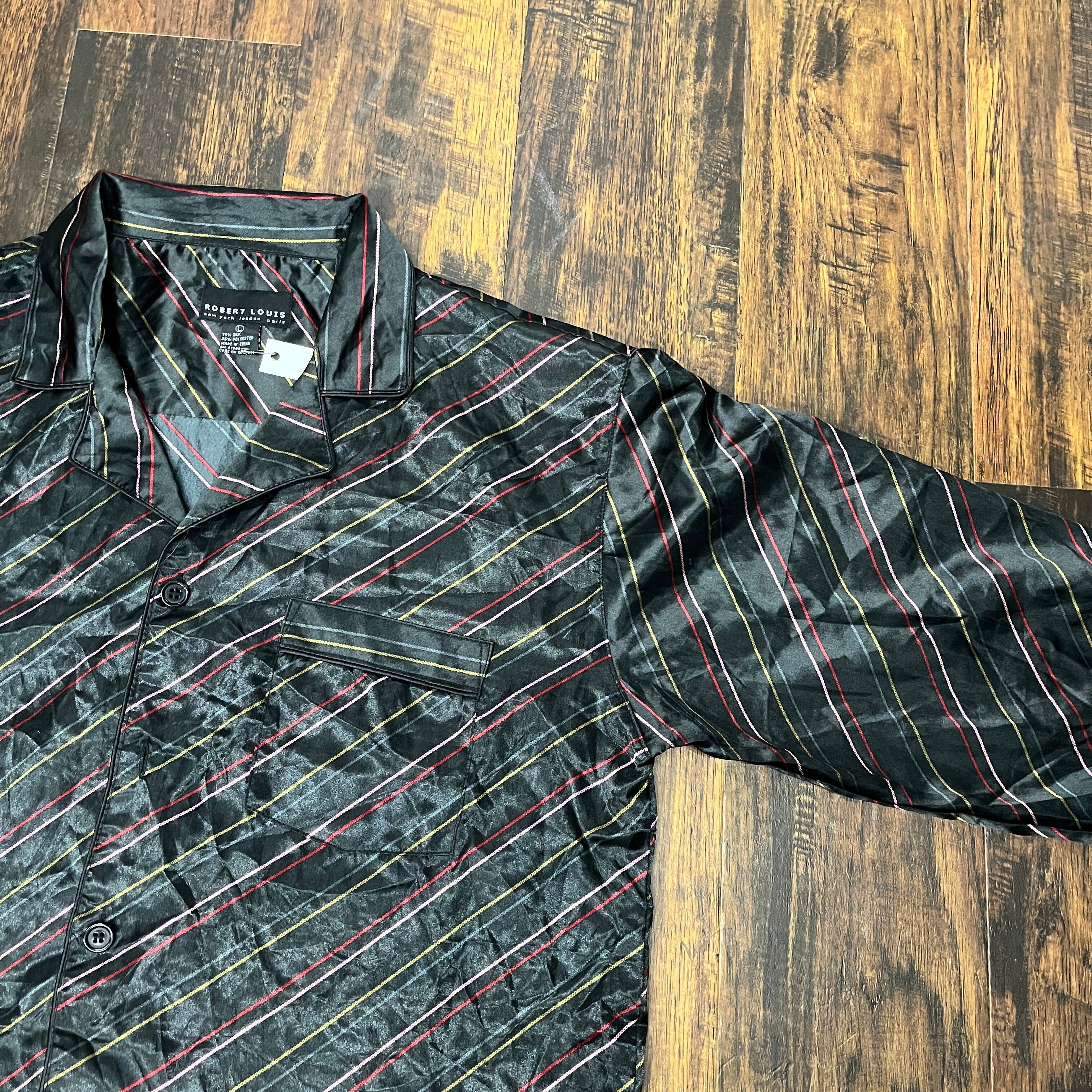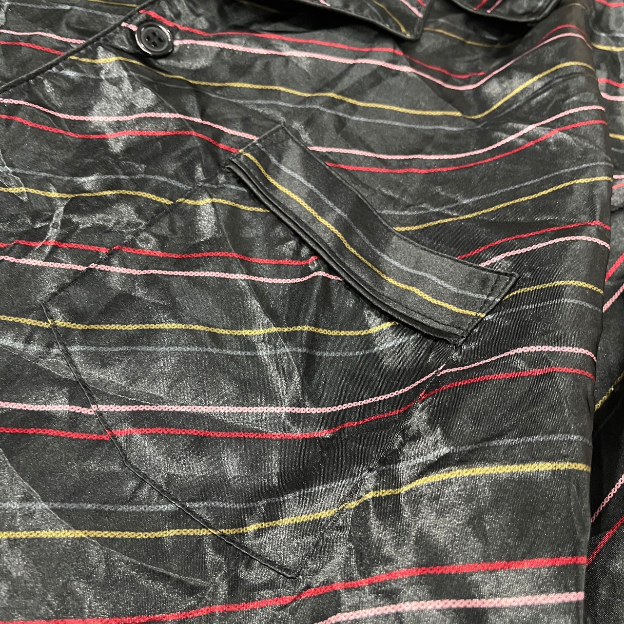 黒と赤のストライプが特徴のLサイズボタン付きシャツ。サテン風の生地で、ポケット付き。