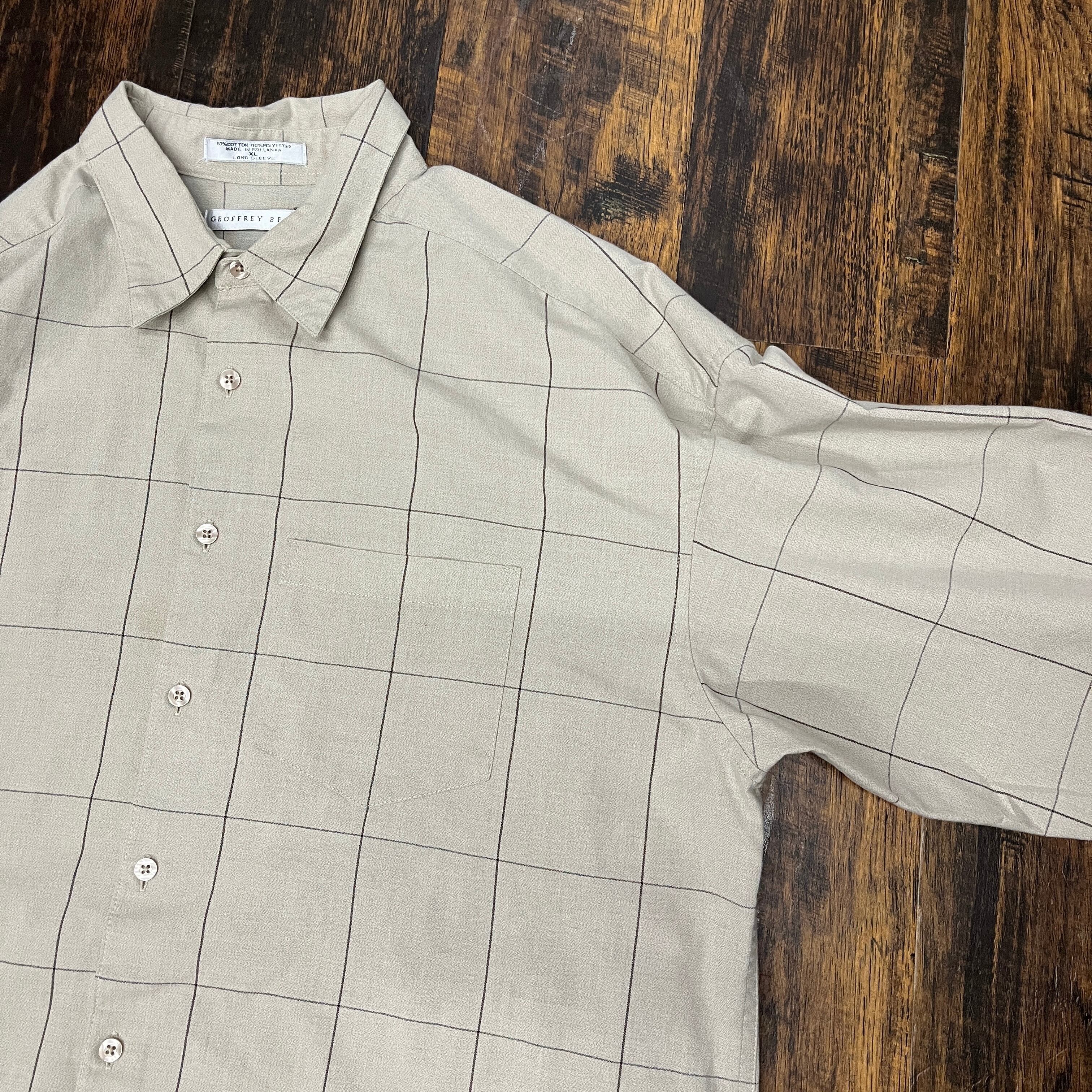 チェック柄のベージュコットンオーバーサイズ長袖シャツ。