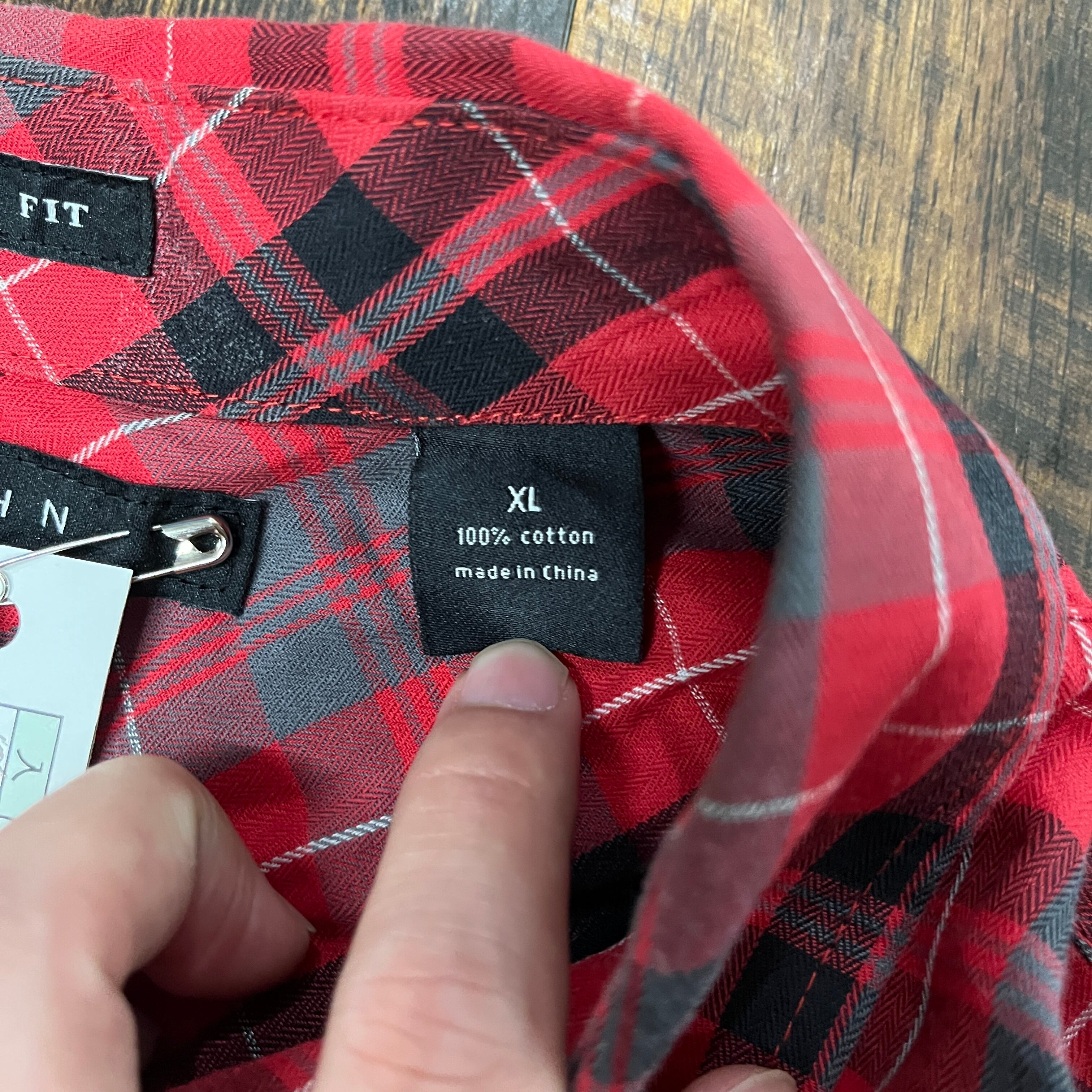 赤と黒のチェック柄の長袖シャツ、胸ポケット付きでスタイリッシュ。