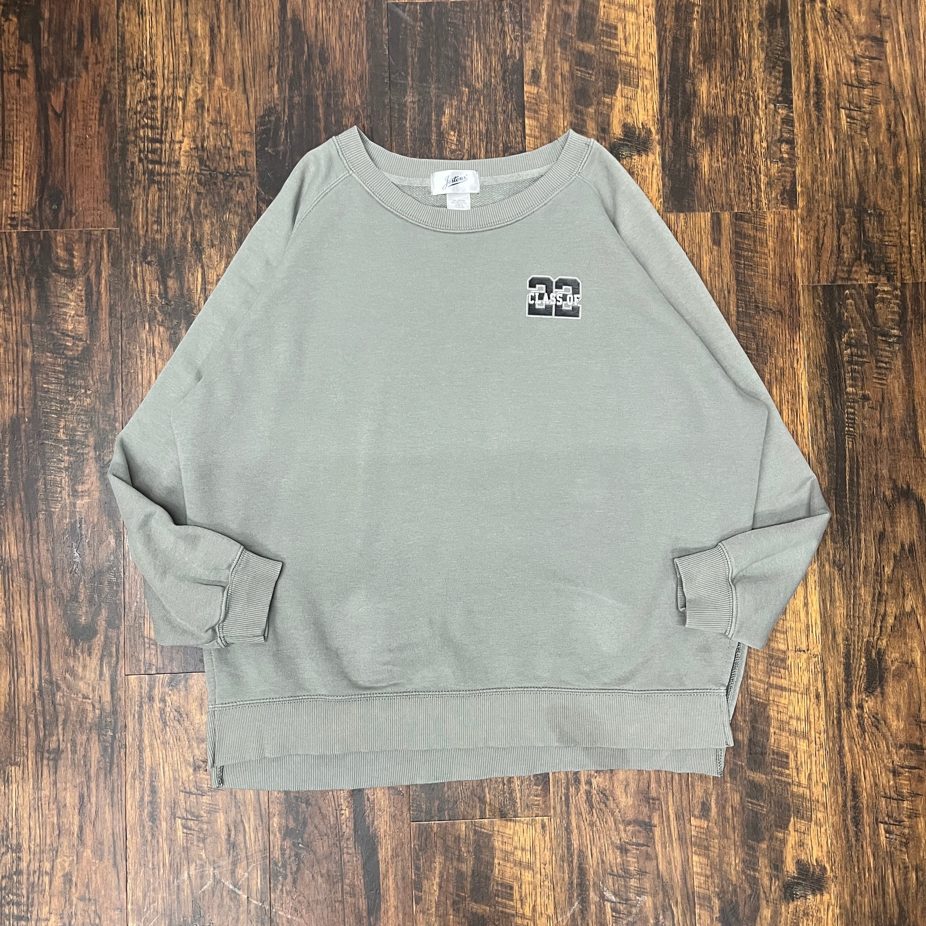 CLASS OF 22の刺繍が施されたグレーのクルーネック長袖スウェット。