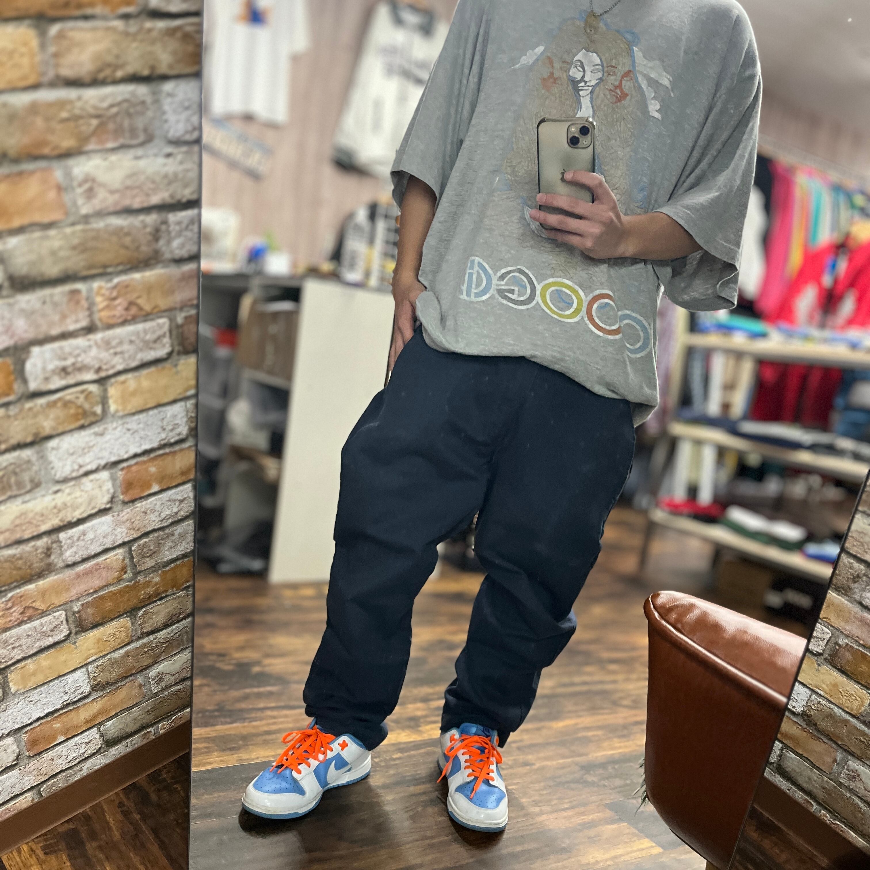 コットン混紡のネイビーのワークパンツ、ストレートレッグデザインで快適な着心地。
