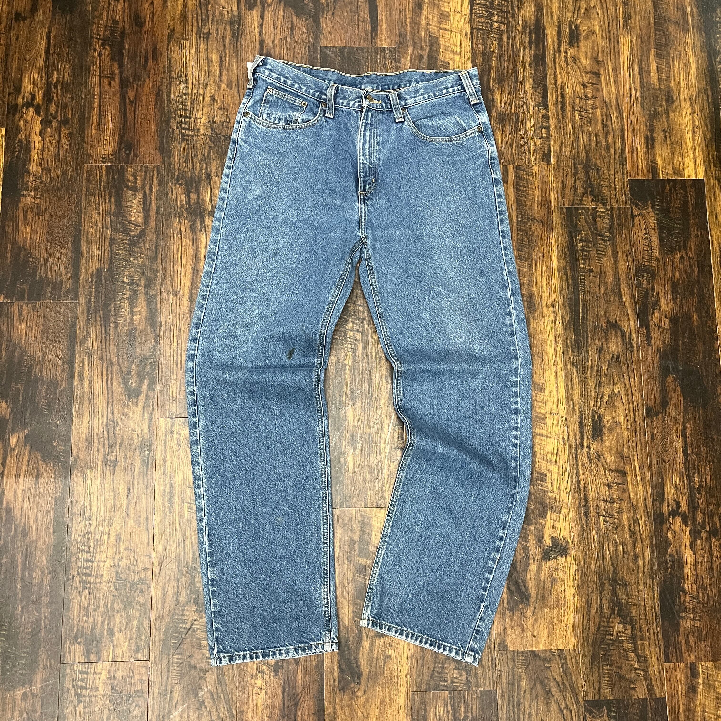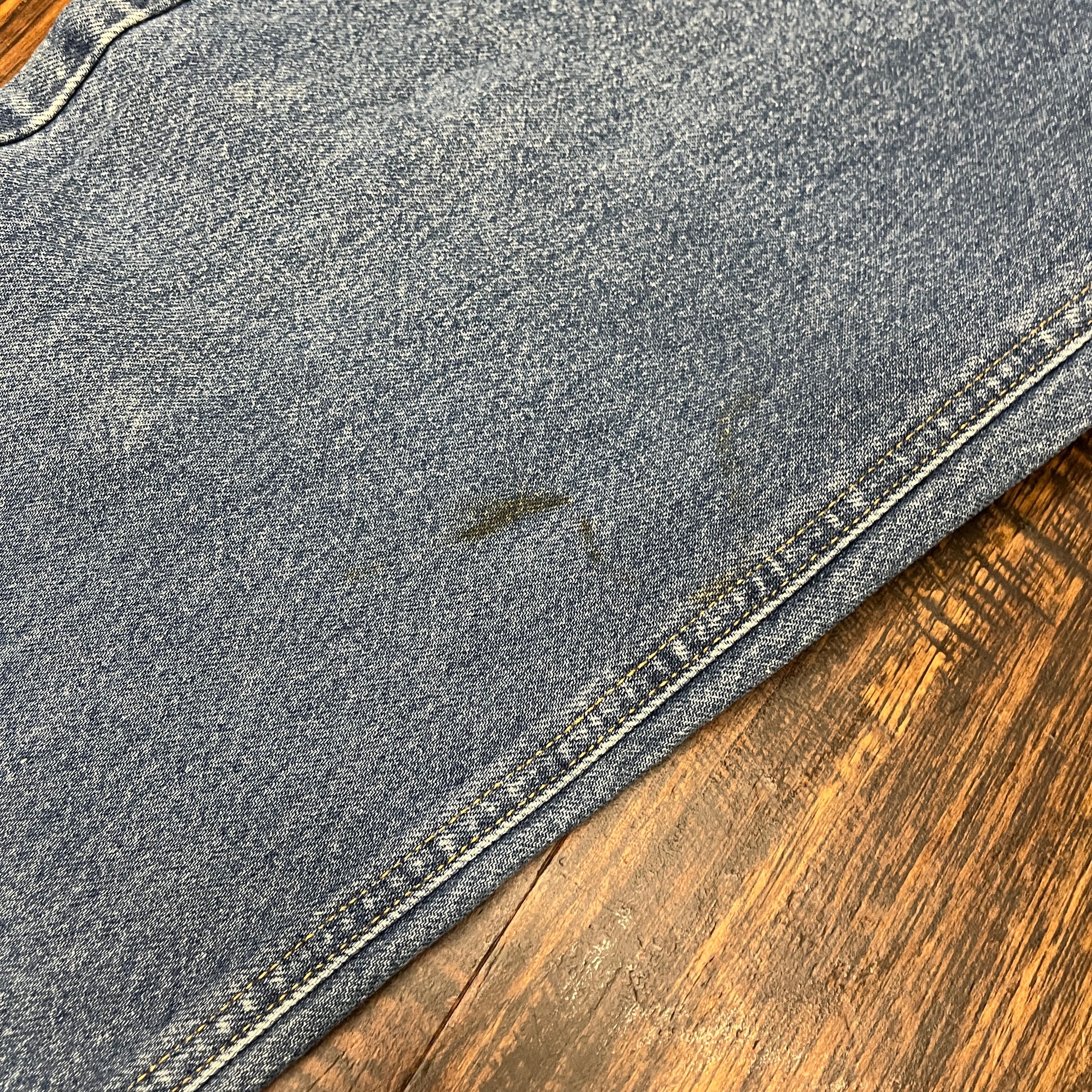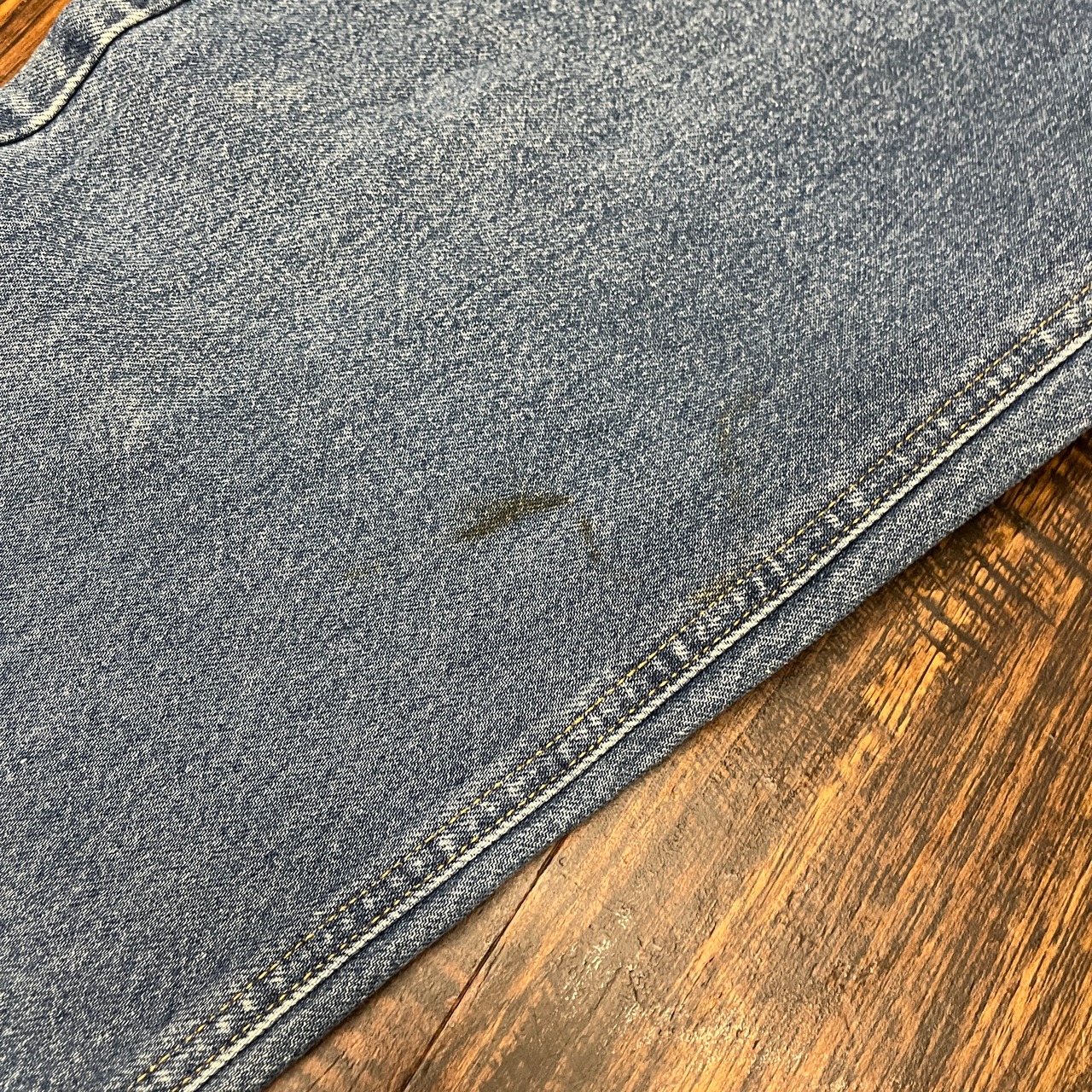 ストレートデザインのブルーデニム、軽い汚れあり。