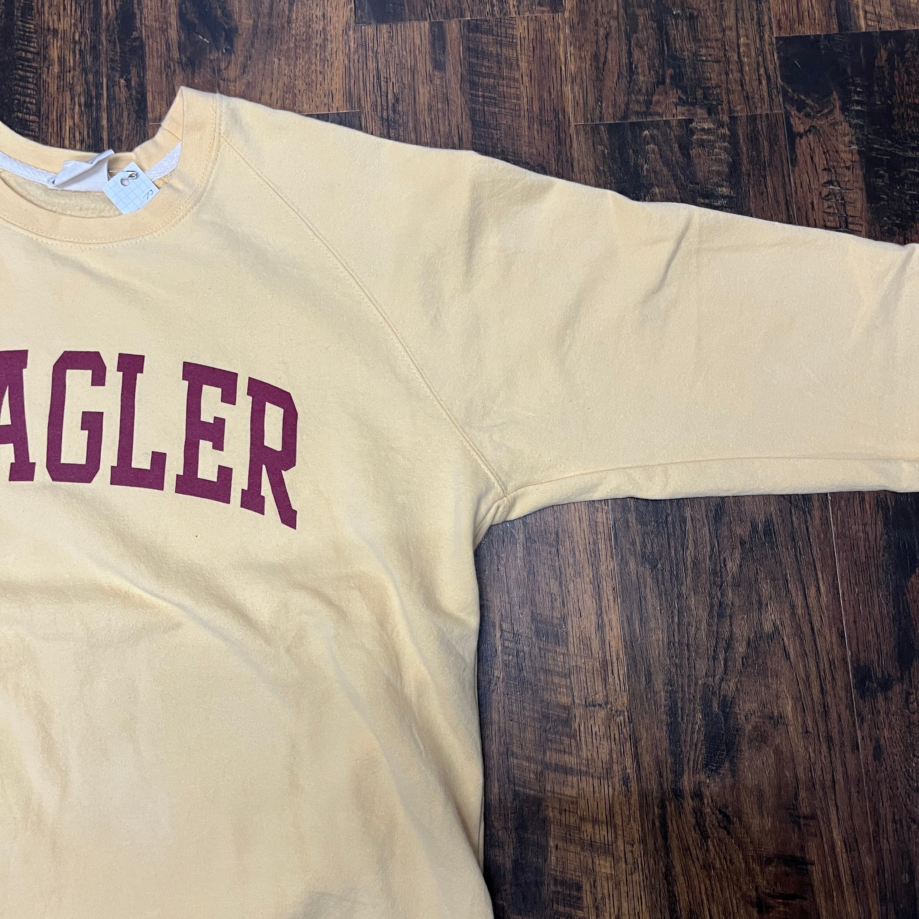 FLAGLERのロゴが施されたイエローの長袖トレーナー。ラグランスリーブの為肩幅、袖丈測定不可です。
